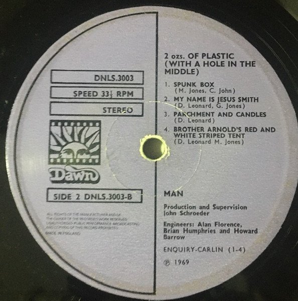 Very early release.. Most probably a repress in the late 60's very early 70's. Front cover does not have release name. Identical runout/matrix to the first original press of 1969. Non-Gatefold release. Man appear only at the front cover but on the right side where release name should be. Release name is not written at all on the cover front or back and even on spine. Sleeve lists the catalog number as "DNLS 3003" while "DNLS.3003" is printed on both labels. Black vinyl, lilac labelled.