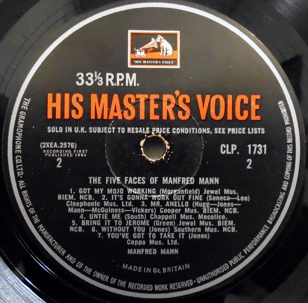 Original UK mono release on black/silver/red HMV labels in front laminated “flipback” cover. Polylined company inner sleeve, advertising other H•M•V LPs. First cat. no. on cover, second on labels. On front cover: MANFRED MANN R & B B1 appears as "I've Got My Mojo Working" on cover, but as "Got My Mojo Working" on label. Recording first published 1964 SOLD IN U.K. SUBJECT TO RESALE PRICE CONDITIONS, SEE PRICE LISTS MADE IN Gt. BRITAIN Made and Printed in Great Britain Printed and made by Garrod & Lofthouse Ltd. Patents pending Publishing: • Jewel Mus. - A1, A5, B1, B5. • Design Mus. - A2. • Upam Mus. Corp. - A3. • Coppa Mus. Ltd. - A4, A6, B7. • Leedes Mus. Ltd. - A7. • Cinephonic Mus. Ltd. - B2. • Cooper Mus. - B3. • Chappell Mus. - B4. • Southern Mus. - B6. Also released in stereo (# CSD 1539). CSD 1539 printed on backcover bottom right corner. Runouts are stamped. Matrix# on labels in parentheses.