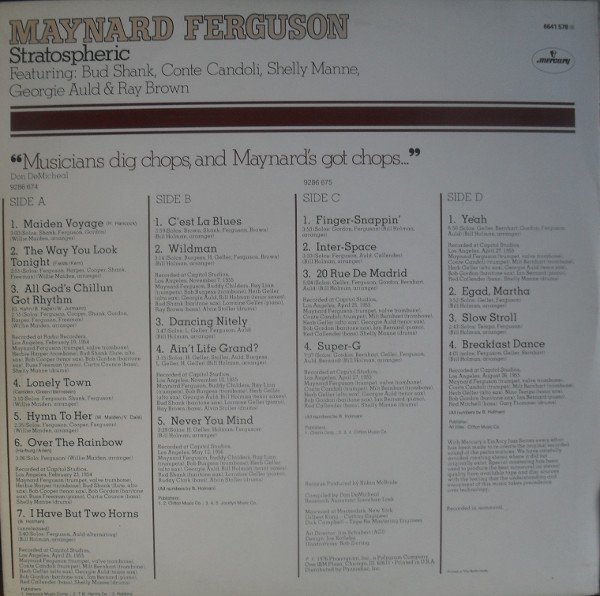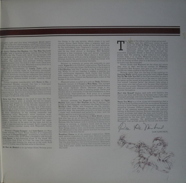 Tracks A1 to A3 recorded at Radio Recorders, Los Angeles, CA, February 19, 1954. Tracks A4 to A6 recorded at Capitol Studios, Los Angeles, CA, February 23, 1954. Tracks A7, C1 to C3 recorded at Capitol Studios, Los Angeles, CA, April 25, 1955. Tracks B1, B2 recorded at Capitol Studios, Los Angeles, CA, November 7, 1955. Tracks B3, B4 recorded at Capitol Studios, Los Angeles, CA, November 10, 1955. Tracks B5 recorded at Capitol Studios, Los Angeles, CA, May 12, 1956. Tracks C4, D1 recorded at Capitol Studios, Los Angeles, CA, April 27, 1955 Tracks D2 to D4 recorded at Capitol Studios, Los Angeles, CA, August 26, 1955. Gatefold sleeve. A1 is composed by Willie Maiden (originally released on "Dimensions"). Herbie Hancock is listed as composer on label but liner notes clearly state it is not Hancock's 1965 composition.