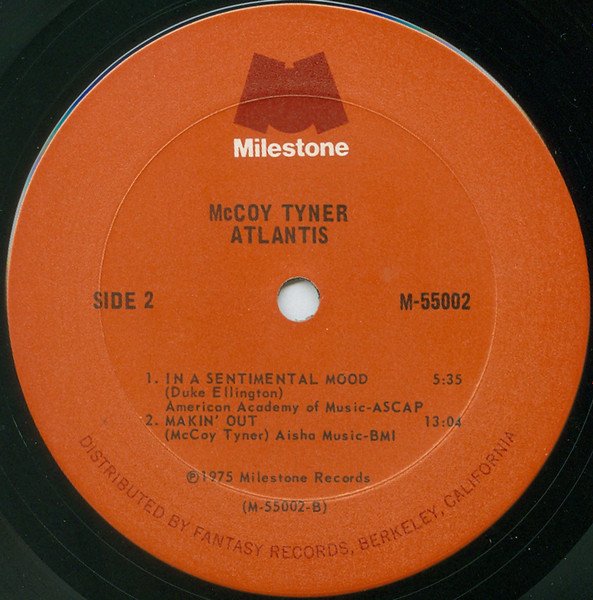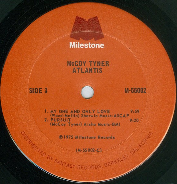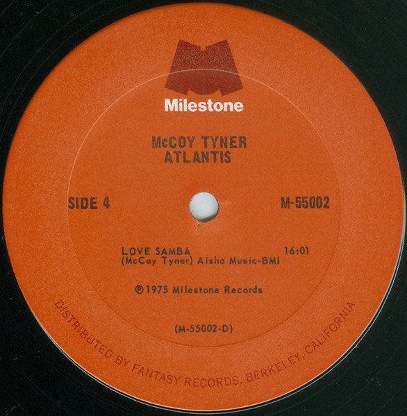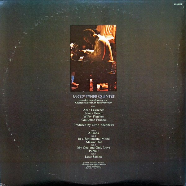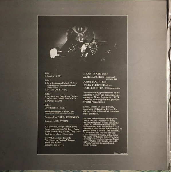 -> Back [a1812886] recorded in performance at Keystone Korner, in San Francisco ℗ 1975, Milestone Records Distributed by Fantasy® Records Tenth and Parker Berkeley, Ca. 94710 -> Inside gatefold: ℗ 1975, Milestone Records Distributed by Fantasy® Records Tenth and Parker Berkeley, Ca. 94710 Recorded during performances at the Keystone Korner, San Francisco, Ca., on August 31 and September 1, 1974. (Remote recording facilities provided by DSR Productions.) For those interested in full discographical details, "Atlantis" was recorded during the first of the group's two sets on Saturday, August 31, immediately followed by the unaccompanied piano performance of "In a Sentimental Mood" (which McCoy Tyner offers as his personal tribute to the late Duke Ellington). "Love Samba" and "My One and Only Love" were recorded in that order, during the second set that same night. (The latter is played by Tyner, Lawrence, and Franco only.) "Makin' Out," directly followed by "Pursuit," are from the second set of Sunday evening. -> Labels: ℗ 1975, Milestone Records Distributed by Fantasy Records, Berkeley, California Published by: A1, B2, C2, S: Aisha Music-BMI B1: American Academy Of Music-ASCAP C1: Sherwin Music-ASCAP