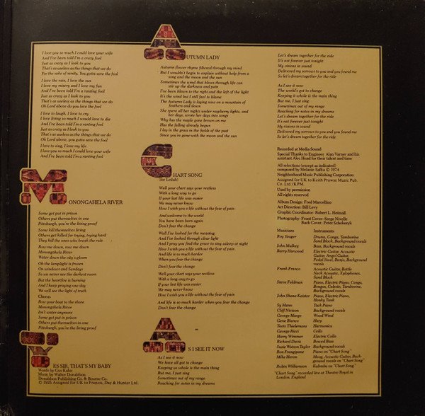 Gatefold sleeve. Made in England. "Chart Song" recorded live at Theatre Royal in London, England Inner gatefold: track B5 subtitled "(For Leilah)"