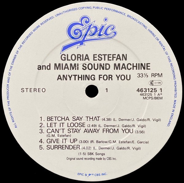 Originally released in 1987 as [url=/Gloria-Estefan-And-Miami-Sound-Machine-Let-It-Loose/master/528851]Let It Loose[/u Comes with a printed insert that has the lyrics printed on one side. On labels, "Gloria Estefan and Miami Sound Machine" printed on two lines. See also: [r7598886] - label variant with "Gloria Estefan and Miami Sound Machine" printed on one line. All matrix runouts have catalogue numbers etched and mothers and stampers stamped.