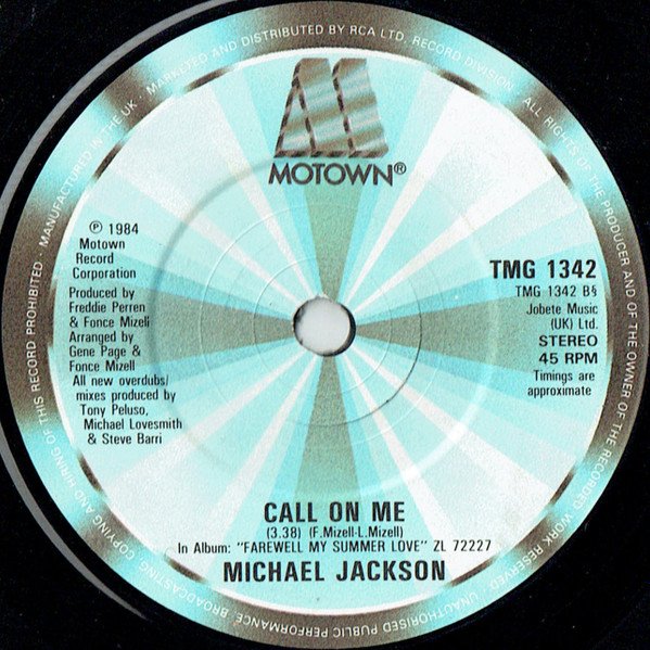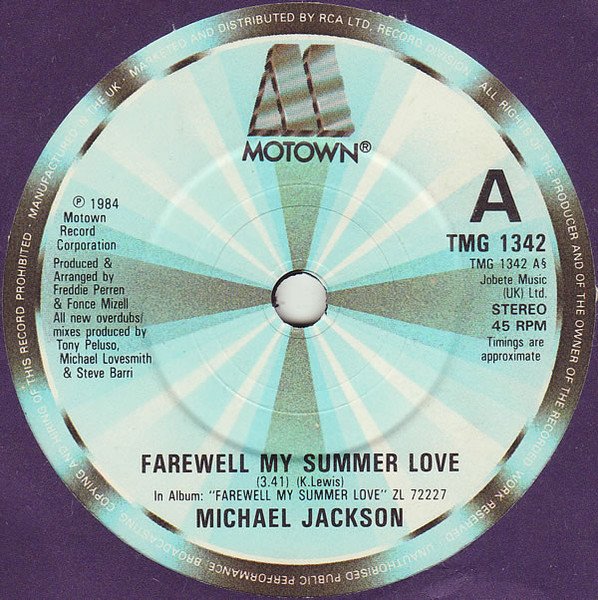Made from master of Motown Record Corporation. Sleeve (C) 1984 RCA Ltd. In Album: [m=101834] [url=http://www.discogs.com/Michael-Jackson-Farewell-My-Summer-Love/release/1501100]ZL 72227[/url]. This release looks almost identical to [r10377753], which differs in that it has an 'SW' plating runout mark instead of a CBS pressing mark, and a different (longer, straight) rear opening lip on the picture sleeve.