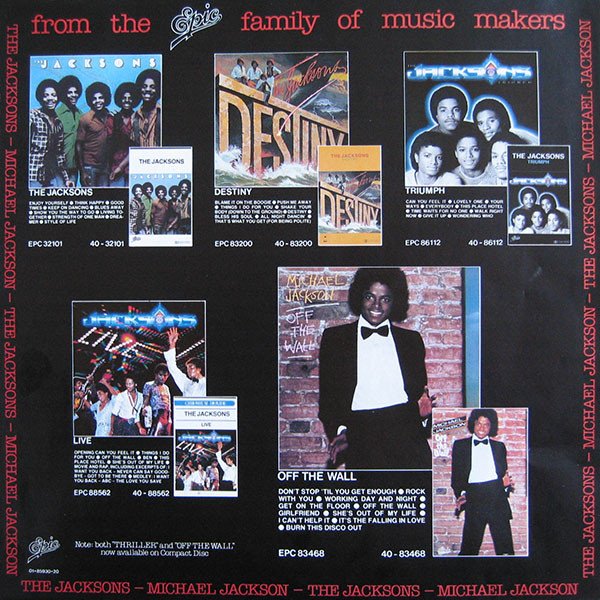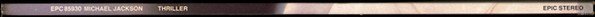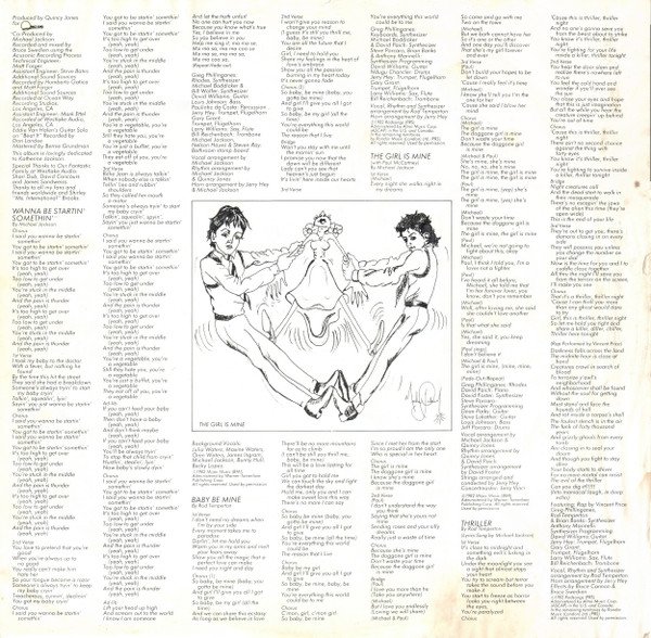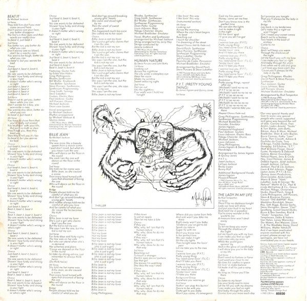 Not to be confused with the version [r1829371] that has only two lines for "Produced by" and "Management" on the back cover (it omits the third "Co-produced by Michael Jackson") and was not distributed to France. This release includes a one sided colour insert with promotional information about Michael Jackson's and The Jacksons' previous albums released on Epic. ℗ 1982 CBS Inc./© 1982 CBS Inc./EPIC & EPIC (Logo) are Trademarks of CBS Inc./ Made In Holland/Distribué en France par CBS Disques Recorded and mixed using the Acusonic Recording Process. Additional sound sources recorded at Ocean Way Recording Studios, Los Angeles, CA. Recorded at Westlake Audio, Los Angeles, CA This album is lovingly dedicated to Katherine Jackson Quincy Jones and James Ingram appear courtesy of Qwest Records David Paich, Steve Porcaro, Jeff Porcaro and Steve Lukather appear courtesy of CBS Records Louis Johnson and Janet Jackson appear courtesy of A&M Records, Inc. Greg Phillinganes appears courtesy of Planet Records Paulinho da Costa appears courtesy of Pablo Records, Inc. Eddie Van Halen appears courtesy of Warner Bros. Records Inc. Howard Hewett appears courtesy of Solar Records Bill Wolfer appears courtesy of Constellation Records Michael Boddicker appears courtesy of Boddifications Paul McCartney appears courtesy of EMI Records Labels: SIDE 1: 33⅓ RPM | STEREO | EPC 85930-1 | AL 38112 | (QE 38112) SIDE 2: 33⅓ RPM | STEREO | EPC 85930-2 | BL 38112 | (QE 38112) Catalog numbers: EPC 85930: Spine & labels 85930: Back cover, gatefold, inner & sticker QE 38112: Labels (US catalog number) Publishing (inner sleeve): A1: ©1982 Mijac Music (BMI) Administered by Warner-Tamerlane Publishing Corp. A2: ©1982 Rodsongs (PRS) Administered by Almo Music Corp. (ASCAP) in the U.S. and Canada; In the remaining territories by Rondor Music (London) Ltd. (PRS) A3: ©1982 Mijac Music (BMI) Administered by Warner-Tamerlane Publishing Corp. A4: ©1982 Rodsongs (PRS) Administered by Almo Music Corp. (ASCAP) in the U.S. and Canada; In the remaining territories by Rondor Music (London) Ltd. (PRS) B1: ©1982 Mijac Music (BMI) Administered by Warner-Tamerlane Publishing Corp. B2: ©1982 Mijac Music (BMI) Administered by Warner-Tamerlane Publishing Corp. B3: ©1982 Porcara Music and John Bettis Music (ASCAP) John Bettis Music administered by WB Music Corp. B4: ©1982 Eiseman Music Co., Inc., Hen-Al Music, Kings Road Music (BMI) and YellowBrick Road Music (ASCAP) B5: ©1982 Rodsongs (PRS) Administered by Almo Music Corp. (ASCAP) in the U.S. and Canada; In the remaining territories by Rondor Music (London) Ltd. (PRS) Publishing (labels): A1: Mijac Music Admin. by Warner-Tamerlane Publishing Corp. A2: Rodsongs Admin. by Almo Music Corp. A3: Mijac Music Admin. by Warner-Tamerlane Publishing Corp. A4: Rodsongs Admin. by Almo Music Corp. B1: Mijac Music Admin. by Warner-Tamerlane Publishing Corp. B2: Mijac Music Admin. by Warner-Tamerlane Publishing Corp. B3: Porcara Music/John Bettis Music Admin. by WB Music Corp. B4: Nissman Music Co., Inc./Han-Al Music/Kings Road Music/Yellow Brick Road Music [Nissman is a typo of Eiseman, Han-Al is a typo of Hen-Al] B5: Rodsongs Admin. by Almo Music Corp. Intro durations (on labels): A1 - :24 A2 - :20 A3 - :12 A4 - :15 B1 - :38 B2 - :29 B3 - :10 B4 - :02 B5 - :20 Issued with inner sleeve printed with lyrics & drawing Some copies come with a silver round hype sticker with text "Das erfolgreichste Album in der Geschichte der Musik"