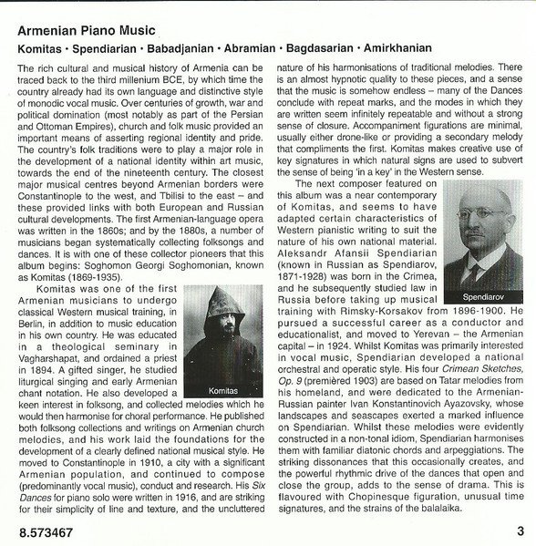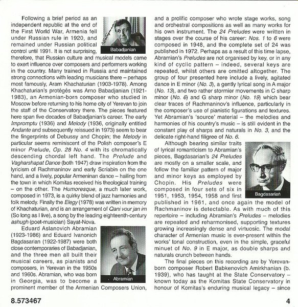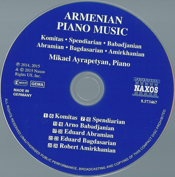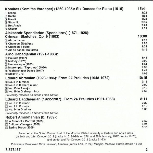 -Made In Germany. -Mikael Played On A Steinway & Sons D 274. -Recorded On 20th And 21st October 2012 (Tracks 1-16, 24-26), On 27th And 28th January 2012 (Tracks 17-20) And On 6th And 7th October 2012 (Tracks 21-23). -6 Page Fold Out Booklet. Total Playing Time: 75:51. -Published By Sovetakan Groh, Yerevan, Armenia (Tracks 1-10, 21-24) And By Muzyka, Moscow, Russia (Tracks 11-20). Composition dates: Six Dances for Piano, 1916 Crimean Sketches, 1903 Prelude, 1947 Melody, 1973 Humoresque, 1973 Impromptu, 'Exprompt', 1936 Vagharshapat Dance, 1947 Elegy, 1978 From 24 Preludes (Abramian), 1948-1972 From 24 Preludes (Bagdasarian), 1951-1958 In Front of a Portrait, 2009 Childrens' Images, 2009 Spring Drops, 2009