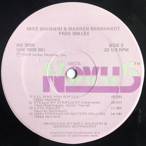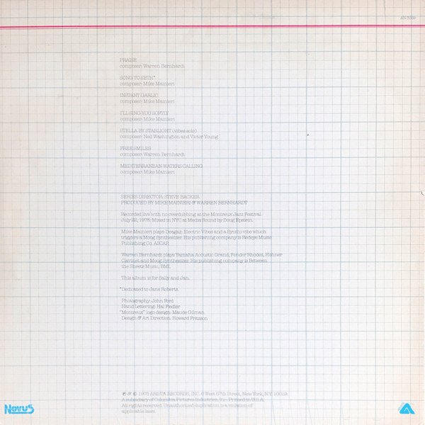 Runouts are etched, "STERLING" stamped. Recorded live with no overdubbing at the Montreux Jazz Festival, July 22, 1978. Mixed in NYC at Media Sound by Doug Epstein. Mike Mainieri plays Deagan Electric Vibes and a Synthi-vibe which triggers a Moog Synthesizer. His publishing company is Redeye Music Publishing Co. ASCAP. Warren Bernhardt plays Yamaha Acoustic Grand, Fender Rhodes, Hohner Clavinet, and Moog Synthesizer. His publishing company is Between the Sheets Music, BMI. This album is for Sally and Jan. A2, 'Song To Seth' dedicated to Jane Roberts. [On back cover:] Printed in U.S.A.