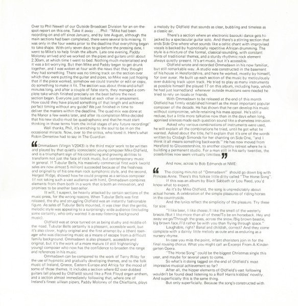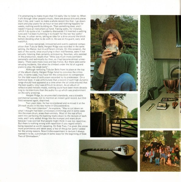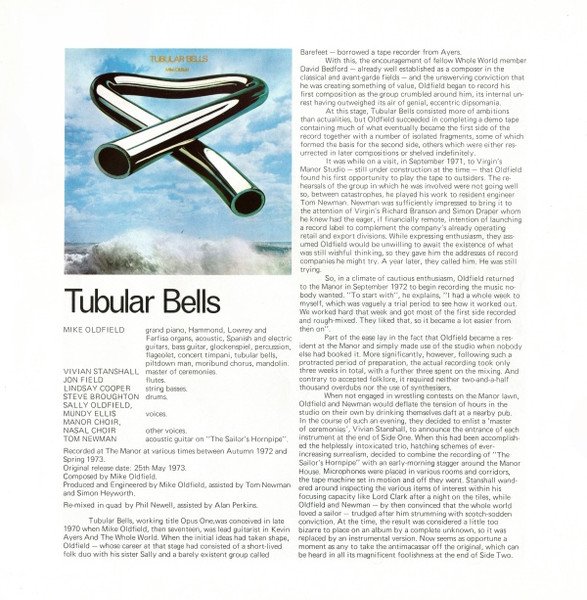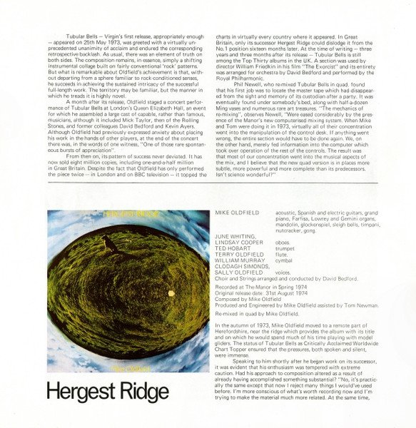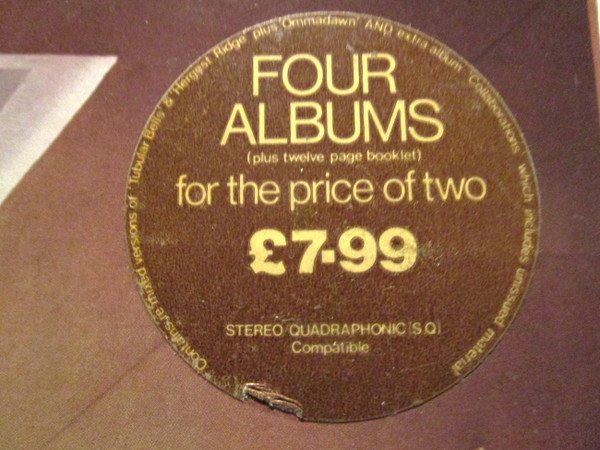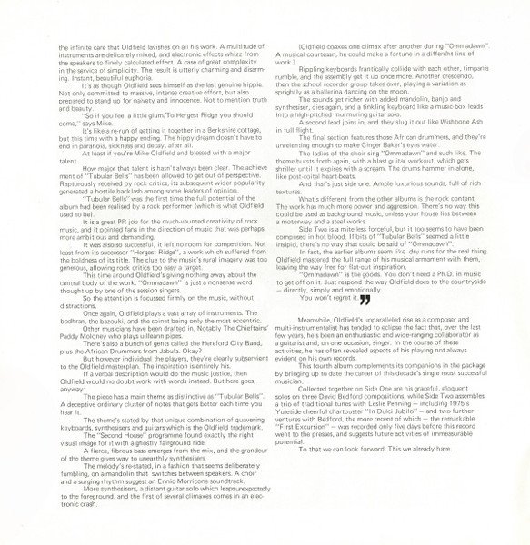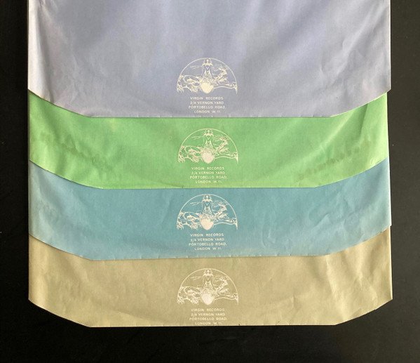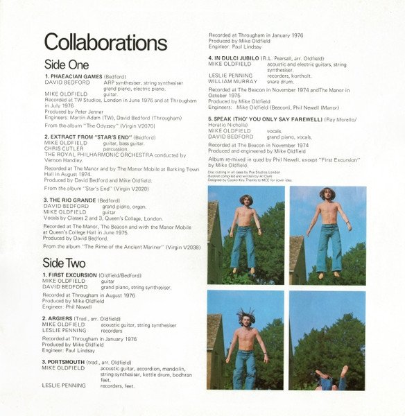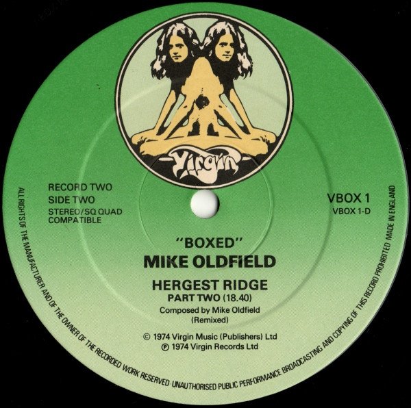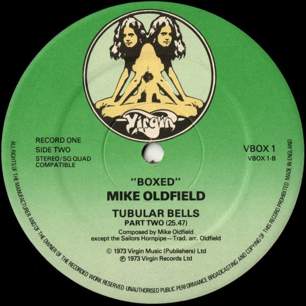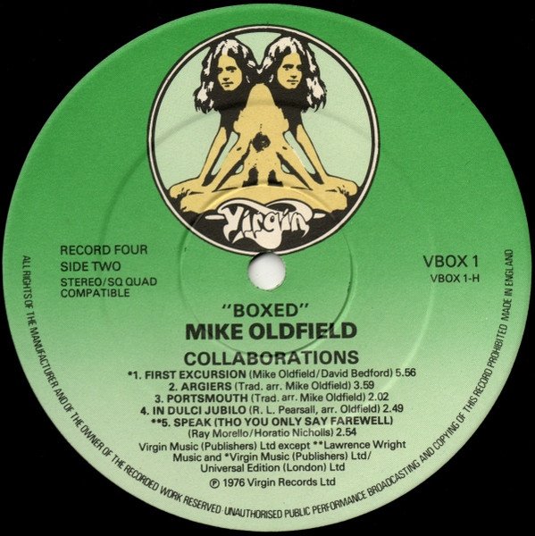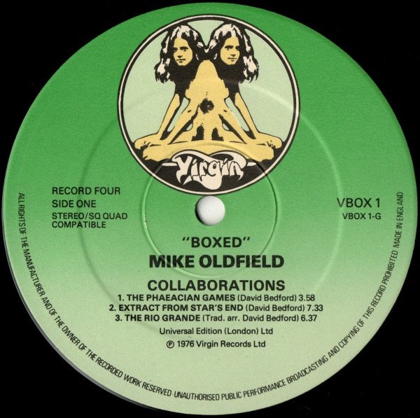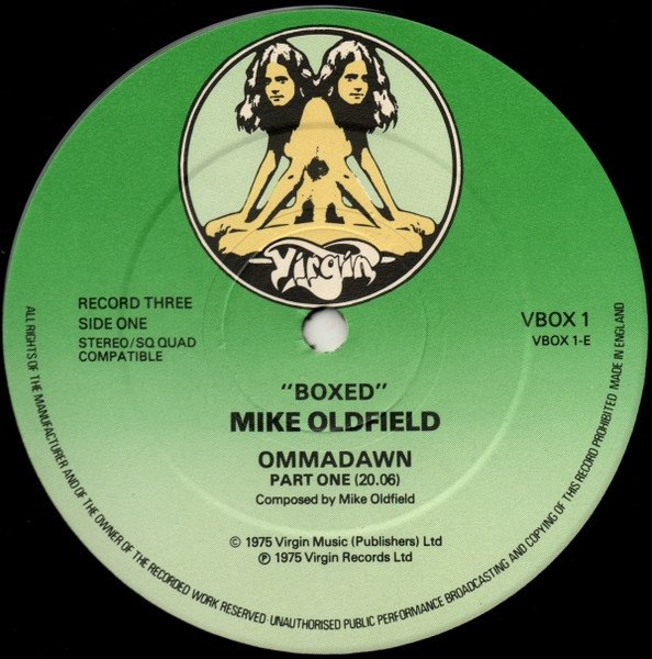 Issued in a boxset with a 12-page 12"-square booklet and four Virgin Records inner sleeves (Green, Blue, Purple and Yellow). LP1: Tubular Bells - released 25.05.1973 Recorded at The Manor at various times between Autumn 1972 and Spring 1973. © 1973 Virgin Music (Publishers) Ltd. ℗ 1973 Virgin Record Ltd. Made in England LP2: Hergest Ridge - released 31.08.1974 Recorded at The Manor in Spring 1974. © 1974 Virgin Music (Publishers) Ltd. ℗ 1974 Virgin Record Ltd. Made in England LP3: Ommadawn - released 21.10.1975 Recorded at The Beacon, Herefordshire, January to September 1975. © 1975 Virgin Music (Publishers) Ltd. ℗ 1975 Virgin Records Ltd. Made in England LP4: Collaborations - no original release G1: Recorded at TW Studios, London in June 1976 and at Througham in July 1976. [Taken from [m186050]] G2: Recorded at The Manor and by The Manor Mobile at Barking Town Hall in August 1974. [Extract from [m121056]] G3: Recorded at The Manor, The Beacon and with The Manor Mobile at Queen's College Hall in June 1975. [Extract from [m121057]] H1: Recorded at Througham in August 1976. H2, H3: Recorded at Througham in January 1976. H4: Recorded at The Beacon in November 1974 and The Manor in October 1975. [Previously released on [url=https://www.discogs.com/release/4871273]single VS 131[/url]] H5: Recorded at The Beacon in November 1974. [Previously released on [url=https://www.discogs.com/release/749048]single VS 163[/url]] Publishers: G1 to H1: Universal Edition (London) Ltd. H1 to H4: Virgin Music (Publishers) Ltd. H5: Lawrence Wright Music ℗ 1976 Virgin Records Ltd. Made in England Remixed in quad. [On back cardboard]: Printed in England.