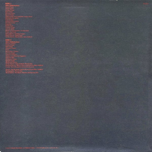Recorded at The Manor, Autumn 1972 - Spring 1973. This version of Tubular Bells is the same stereo remix that appears in the [m=17820] compilation. The real duration of track B is 23:25 and a hidden aircraft motor recording is audible from 23:33 to 24:28. [r=7186591] looks similar to this release but doesn't contain the aircraft noise on the track. â„— 1973 Virgin Records. Track titles are just: SIDE 1 and SIDE 2 on the release.