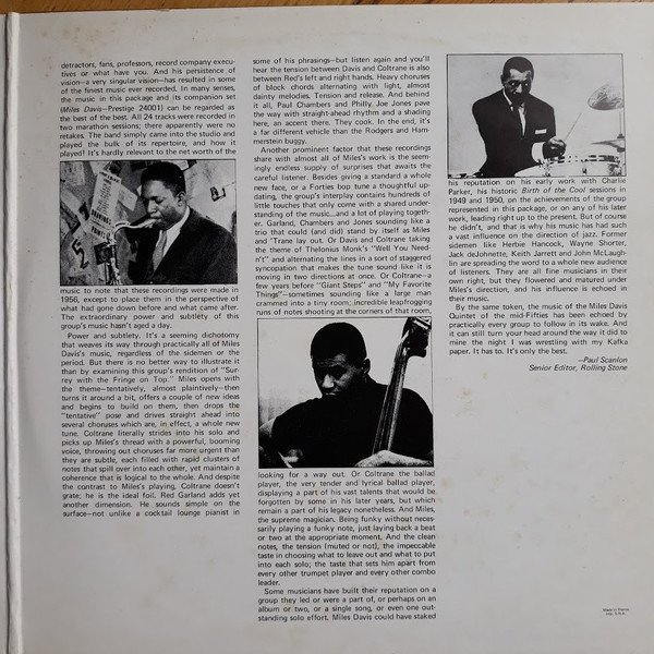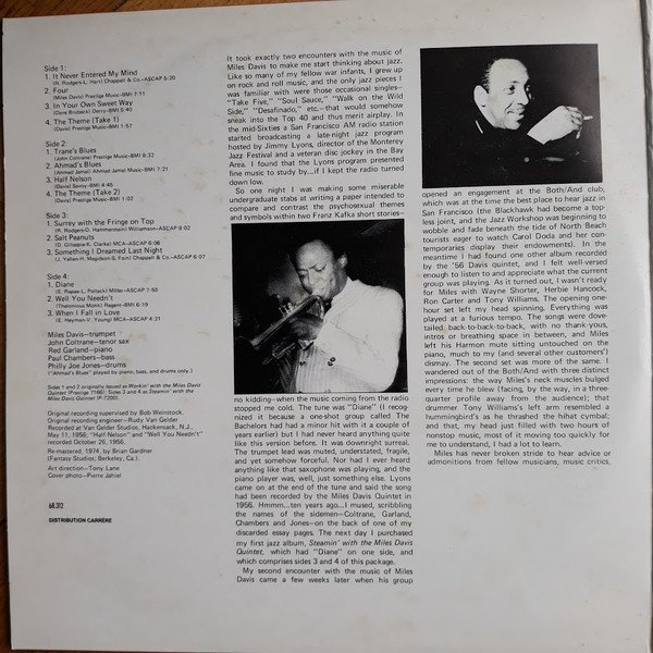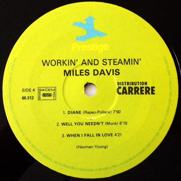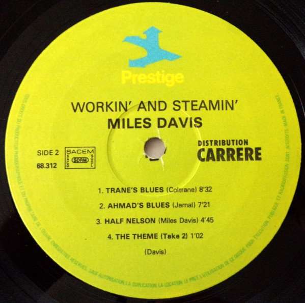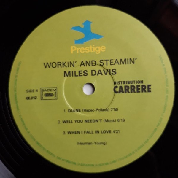 Sides 1 and 2 originally released as "Workin' With The Miles Davis Quintet" (Prestige 7166); Sides 3 and 4 as "Steamin' With The Miles Davis Quintet" (Prestige P-7200). Recorded at Van Gelder Studios, Hackensack, NJ, May 11, 1956, except tracks B3 and D2 recorded October 26, 1956. Remastered 1974 at Fantasy Studios - Berkeley, CA. Released 1981 according to legal deposit at Bibliothèque Nationale de France, as stated on BNF site. This release has no barcode.