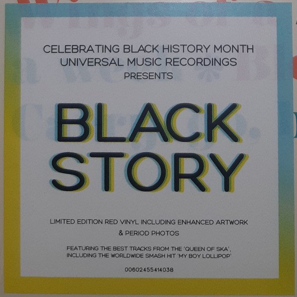 Made in Poland printed on shrink wrap on back cover. Hyper sticker reads "CELEBRATING BLACK HISTORY MONTH UNIVERSAL MUSIC RECORDINGS PRESENTS BLACK STORY LIMITED EDITION RED VINYL INCLUDING ENHANCED ARTWORK & PERIOD PHOTOS FEATURING THE BEST TRACKS FROM THE 'QUEEN OF SKA', INCLUDING THE WORLDWIDE SMASH HIT 'MY BOY LOLLIPOP' 00602455414038