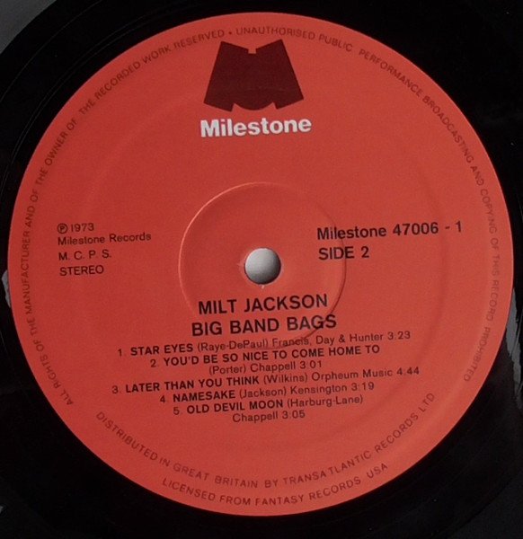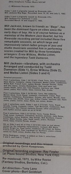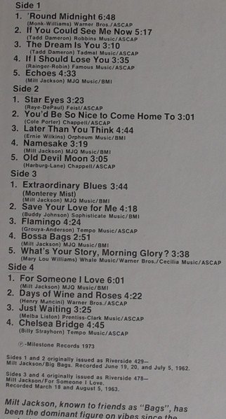 Sides 1 and 2 originally issues as Riverside 429-- Milt Jackson/ Big Bags. Recorded June 19, 20, and July 5, 1962. Sides 3 and 4 originally issues as Riverside 478-- Milt Jackson/ For Someone I Love. Recorded March 18 and August 5, 1963. Specially Priced Two-Record Set Gatefold sleeve Different Label