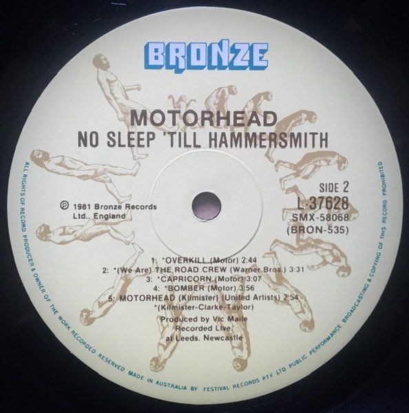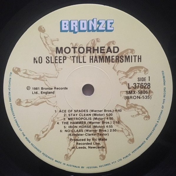 On label circumference: Made in Australia by Festival Records Pty. Ltd. Title mis-spelt on labels as 'No Sleep 'Till Hammersmith' Initial pressing contained hype label and patch. Runout info is etched.