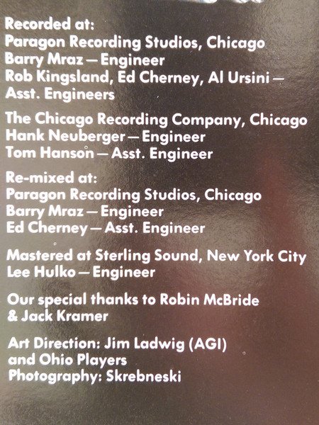 Recorded at Paragon Recording Studios, Chicago and The Chicago Recording Company, Chicago. Re-mixed at Paragon Recording Studios, Chicago. Mastered at Sterling Sound, New York City. Runouts are etched, STERLING is stamped.