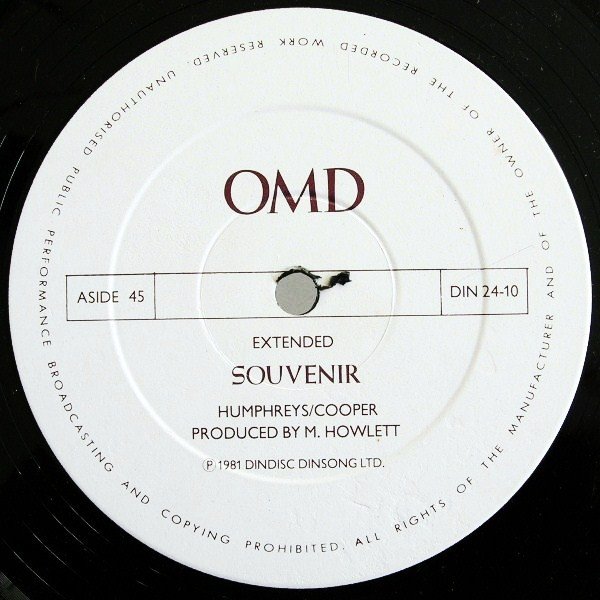 This release has the image centered in the picture sleeve and has White labels with Purple text. "Extended Souvenir" features an extra verse from the 7" and album version of "Souvenir". The original 10" sleeve is very different from the 7" release as it features the Düsseldorf street scene in full on the cover and also featured a sticker on initial releases. Later pressings shifted the picture up so that it 'bled' off the sleeve. Some releases had white record labels with purple text and some had black text. ℗ 1981 Dindisc Dinsong Ltd. ℗ & © 1981 Dindisc