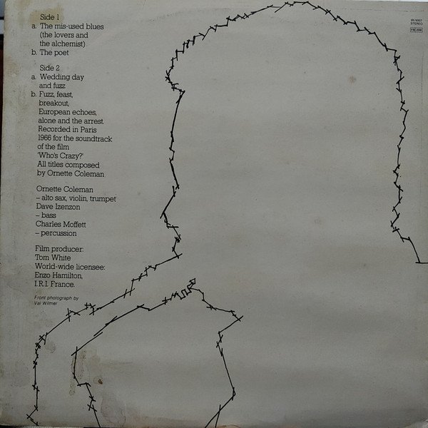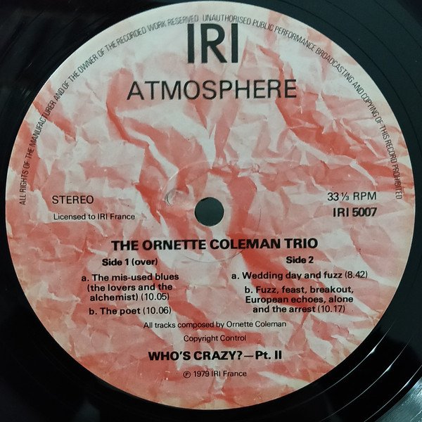 Runouts are etched. [Back cover] Recorded in Paris 1966 for the soundtrack of the film 'Who's Crazy?' World-wide licensee: Enzo Hamilton, I.R.I. France. [Spine] Atmosphere Records Ornette Coleman Who's Crazy Pt.II IRI 5007 [Label] Licensed to IRI France ℗ 1979 IRI France
