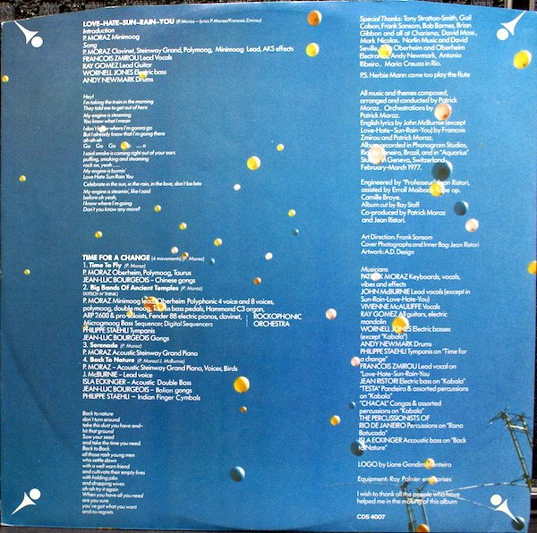 Duration of tracks not indicated on sleeve or record labels. Comes with inner sleeve with lyrics and credits. Album recorded in Phonogram Studios, Rio-de-Janeiro, Brazil, and in Aquarius Studios in Geneva, Switzerland February-March 1977. On sleeve: Marketed by Charisma Records Ltd., 90 Wardour St., London W1. Manufactured and Distributed by Phonogram Ltd. On labels: Marketed and distributed by Phonogram Ltd. ℗ 1977 Charisma Records Ltd.