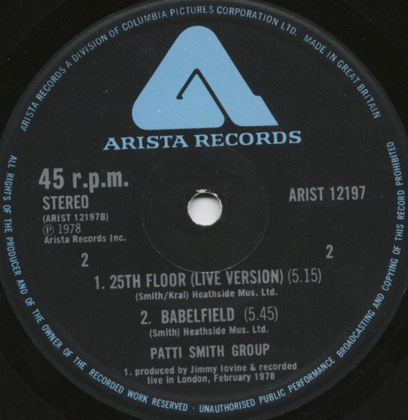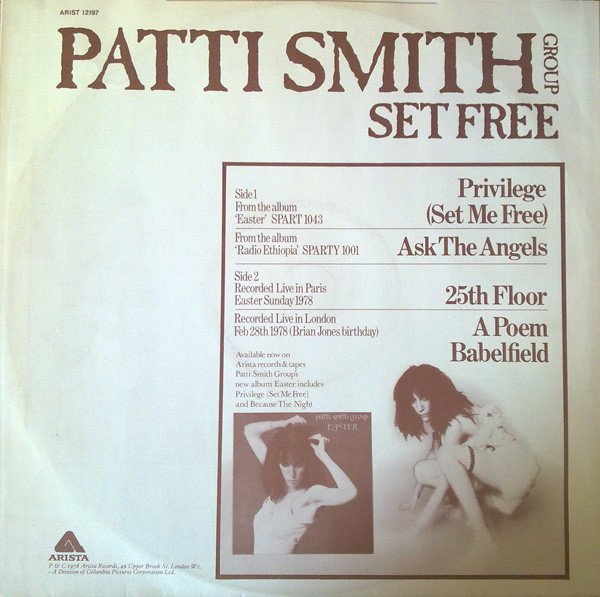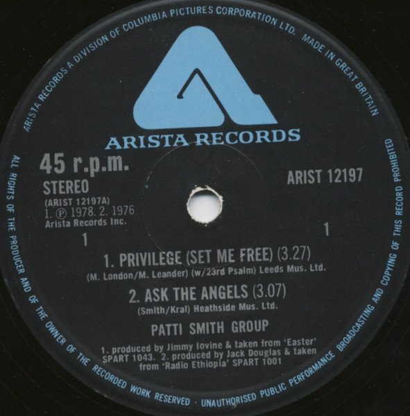 A1: From the album [url=https://www.discogs.com/Patti-Smith-Group-Easter/master/40121]Easter[/url] SPART 1043 A2: From the album [url=https://www.discogs.com/Patti-Smith-Group-Radio-Ethiopia/master/40133]Radio Ethiopia[/url] SPART 1001 B1: Recorded Live in Paris, Easter Sunday 1978 B2: A Poem. Recorded Live in London, Feb 28th 1978 (Brian Jones birthday)A1. Leeds Mus. Ltd A2-B2. Heathside Mus. Ltd.P & C 1978 Arista Records, 49 Upper Brook St. London W1. - A Division of Columbia Pictures Corporation Ltd.