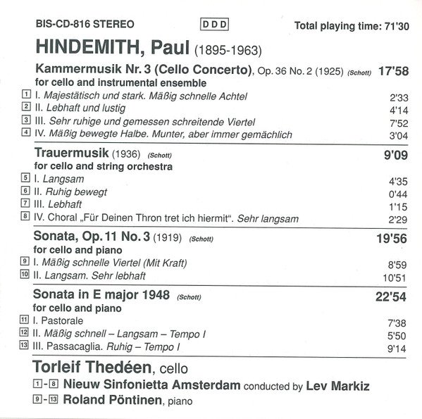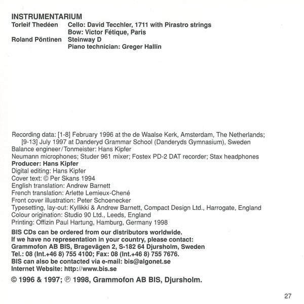 Packaged in a standard jewel case with 28 page booklet containing liner notes in English, German and French. In booklet: All works published by Schott Instrumentarium: Torleif Thedéen - Cello: David Tecchler, 1711 with Pirastro strings, Bow: Victor Fétique, Paris Roland Pöntinen - Piano: Steinway D Recording data: [1-8] February 1996 at the de Waalse Kerk, Amsterdam, The Netherlands [9-13] July 1997 at Danderyd Grammar School (Danderyds Gymnasium), Sweden Recording equipment: Neumann microphones; Studer 961 mixer; Fostex PD-2 DAT recorder; Stax headphones © 1996 & 1997; ℗ 1998, Grammofon AB BIS, Djursholm On disc: An original Digital recording © 1996 & 1997 ℗ 1998, Grammofon AB BIS n©b Made in Austria by DADC On traycard: Total playing time: 71'30 © 1996 & 1997; ℗ 1998, Grammofon AB BIS Made in Austria.