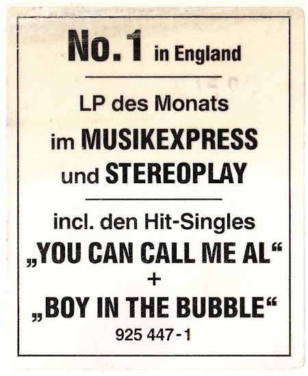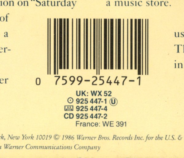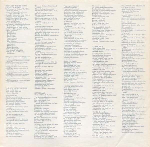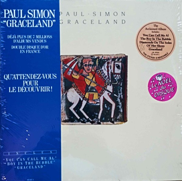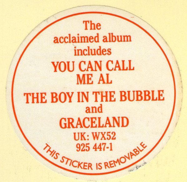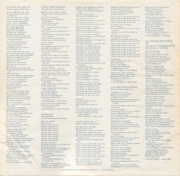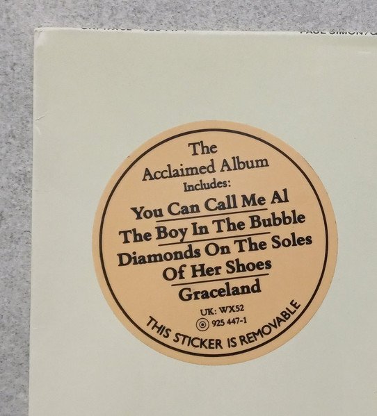 Specific features: - Embossed horseman picture on front cover, i.e. slightly raised, - Debossed Warner Bros "W" stamp on back cover, bottom right. - This pressing is without the embossed bass clef "𝄢" on label B. - Same information printed on the upper seam side and title spine, i.e. cat. no., artist name and album's title. - Runout inscriptions contain stamped and etched parts. Stamped is the main matrix no's string starting with "R/S Alsdorf..." and ending with side indicator A/B plus number, e.g. variant 26, side A/B: "R/S Alsdorf 925447-1-A3/"R/S Alsdorf 925447-1-B3". The rest of runout inscriptions is etched. - Comes with a printed inner sleeve containing lyrics, credits, and other information. - Some copies have the side A label on both sides. - There are several different hype-stickers known to exist. Please check photo gallery for details. Back cover: Warner Bros. Records Inc., a Warner Communications Company [Warner "W" logo] 3300, Warner Blvd., Burbank, Calif. 91510. 75 Rockefeller Plaza, New York, New York 10019 © 1986 Warner Bros. Records Inc. for the U.S. & WEA International Inc. for the world outside of the U.S. ℗ 1986 Paul Simon... Manufactured in Germany by Record Service GmbH, Alsdorf · Pressé en Allemagne par Record Service GmbH, Alsdorf [Warner "W" logo] a Warner Communications Company Inner sleeve: Originally Mastered [...] at Sterling Sound, New York DMM Direct Digital Mastering Icon courtesy of Langmuir Collection, Peabody Museum of Salem All Songs Copyright © 1986 Paul Simon BMI [a473371] appears courtesy of [l589745] [a55902] appears courtesy of [l8377] [a441146] appear courtesy of [l114992] The [a145071] appear courtesy of [l129352] [a258118] appears courtesy of [l321438] Good Rockin' Dopsie and The Twisters appear courtesy of [l36675] [a328200] appears courtesy of Cartridge T.V./CCP [a49397] appears courtesy of [l114992] [a173717] appear courtesy of [l2831] [a136198] appears courtesy of [l129352] [a1787266] appears courtesy of [l26126]/CCP [a17590] appears courtesy of [l577821], Paris [a262943] appears courtesy of [l120636] [a867947] and [a441145] appear courtesy of [l56609]/CCP [a396513] appears courtesy of [l114992] A1 to A4, B4: Recorded at Ovation Studios, Johannesburg, R.S.A. A5 to B2: Recorded at The Hit Factory, New York, U.S.A. B3: Recorded at Abbey Road Studios, London, England B5: Recorded at Master-Trak Enterprises, Crowley, Louisiana, U.S.A. B6: Recorded at Amigo Studios, Los Angeles, U.S.A. A1: Background Vocals: [...] Recorded at The Hit Factory, New York, U.S.A. A2: Background Vocals: [...] Recorded at Amigo Studios, Los Angeles, U.S.A. [...] and at The Hit Factory, New York, U.S.A. A3: Synclavier: [...] Recorded at The Hit Factory, New York, U.S.A. A4: Synclavier, Percussion, Background Vocals: [...] Recorded at The Hit Factory, New York, U.S.A. B2: Vocals: [...] Recorded at Amigo Studios, Los Angeles, U.S.A. B4: Soprano Sax, Guitar Synthesizer, Background Vocals: [...] Recorded at The Hit Factory, New York, U.S.A. B6: Acoustic Guitar, Additional Drums, Percussion: [...] Recorded at The Hit Factory, New York, U.S.A. © 1986 Warner Bros. Records Inc. for the U.S. Labels: All songs copyright 1986 Paul Simon except [A4] Paul Simon, by courtesy of Gallo (Africa) Ltd. All Rights in the U.K. controlled by Pattern Music Ltd. ℗ + © 1986 Paul Simon Made in Germany by WEA Musik GmbH [Warner "W" logo] a Warner Communications Company Cat# 925 447-1 on the back cover, spine and labels Cat# WX 52 on the back cover and spine Cat# WX52 on the labels