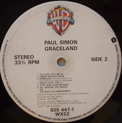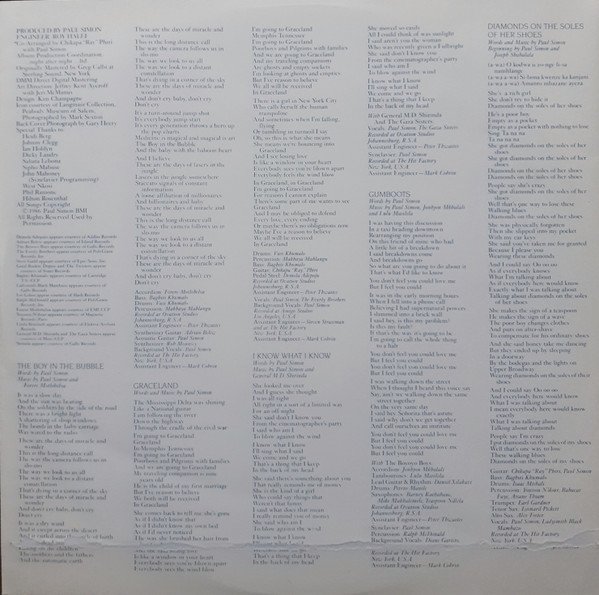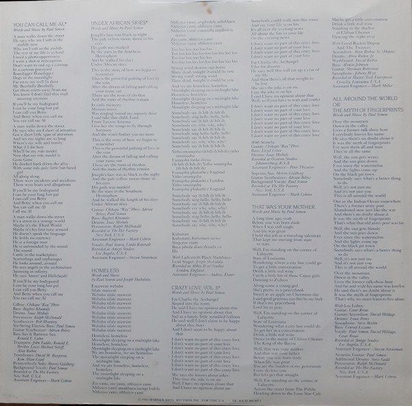 UK: WX 52 [LP logo] 925 447-1 Ⓤ [MC logo] 925 447-4 CD 925 447-2 France: WE 391 Warner Bros. Records Inc., a Warner Communications Company [Warner W logo] 3300, Warner Blvd., Burbank, Calif. 91510. 75 Rockefeller Plaza, New York, New York 10019 © 1986 Warner Bros. Records Inc. for the U.S. & WEA International Inc. for the world outside of the U.S. ℗ 1986 Paul Simon. Comes with a lyric inner sleeve.