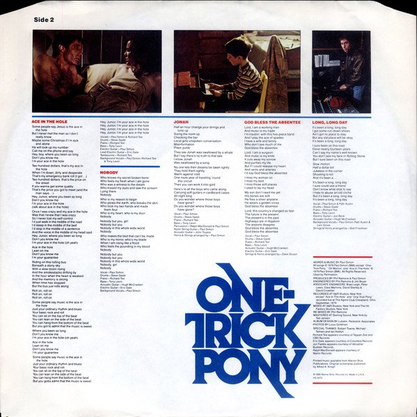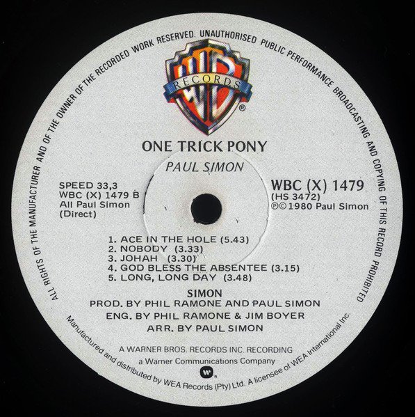 The music on this album was created for the Paul Simon Movie "One-Trick Pony." Original copies came with inner photo sleeve, dead wax indicates mastering by "Sterling". Recorded at A&R Studios, New York except "Ace in the hole" and "One Trick Pony" recorded live at The Agora Club/Cleveland, Ohio September, 1979. Some releases included a folded insert, in black & white, featuring other domestically available "Greatest Hits" releases (see images)