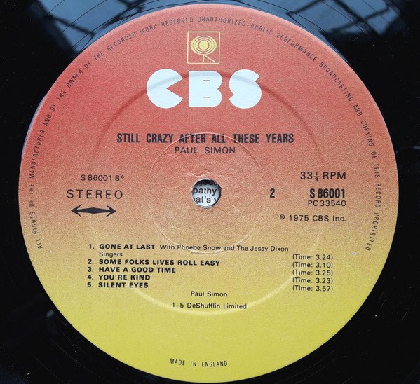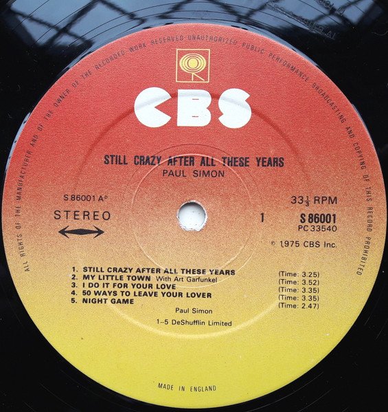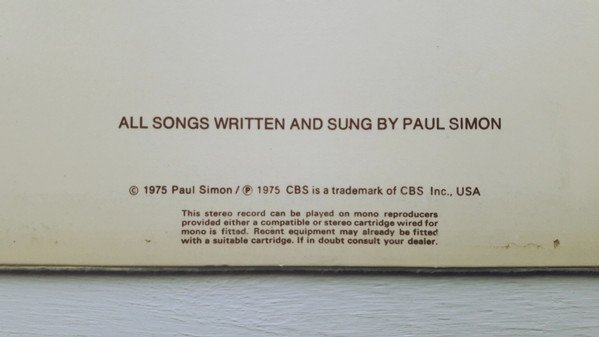 Cat# CBS 86001 on spine & inner sleeve Cat# S 86001 on labels PC33540 on label below Cat# this version shows ⓟ 1975 CBS Inc on label other variant shows ⓟ Paul Simon on label Made in England Embossed titles on front cover Cardboard inner sleeve with lyrics with square corners Double-sided insert with "The Simon and Garfunkel Story" some versions have sticker on sleeve saying "Includes Hit single GONE AT LAST 86001" later variant (ⓟ 1975 Paul Simon on label) may have sticker on sleeve saying "Album includes Gone At Last and the Simon & Garfunkel hit single My Little Town 86001"