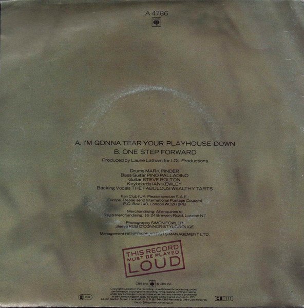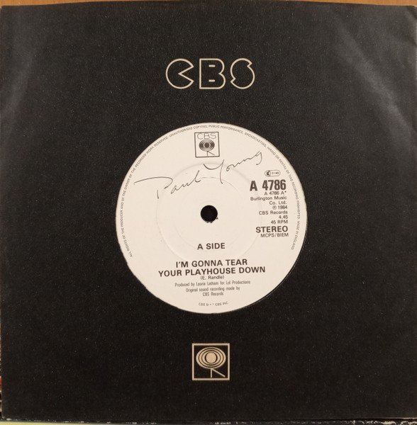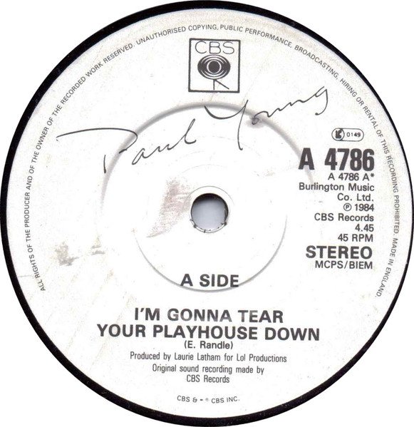 ℗ 1984 CBS Records ©1984 CBS Records Manufactured and Distributed by CBS Records UK. Limited edition poster bag with [url=http://www.discogs.com/Paul-Young-Im-Gonna-Tear-Your-Playhouse-Down/release/1695719]same cat #[/url] as regular release.
