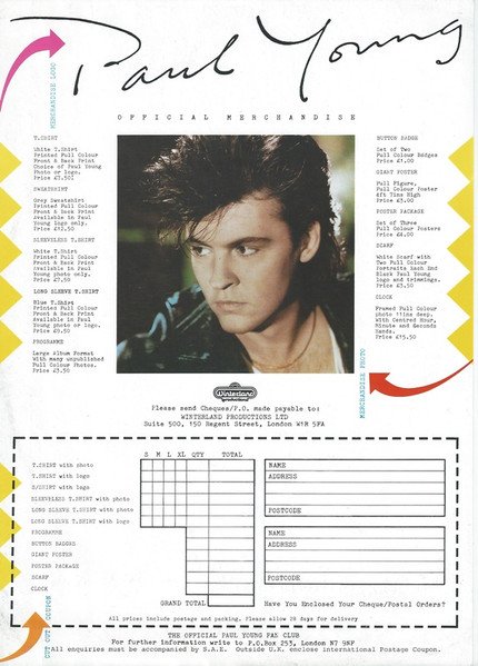 Includes a printed inner with photos and credits. 1st pressing with large yellow sticker on the front stating 'New PAUL YOUNG LP includes (3 titles) 26234' and later issued with the same sticker but 4 titles instead of 3. Some copies used as promo, with a gold stamp on back cover "Demonstration only not for sale". Some copies with merchandise insert. [Back] ℗ 1985 CBS Records/© 1985 CBS Records [Back & labels] Made in Holland. [Labels] Stereo ℗ 1985 CBS Records Cat# 26234 on back cover. Cat# CBS 26234 spine, inner sleeve and labels. Hint: This version credits B. Livsey and G. Lyle as writers of track A1 whereas otherwise identical version [r=13393145] credits M. Palm. Runouts are stamped
