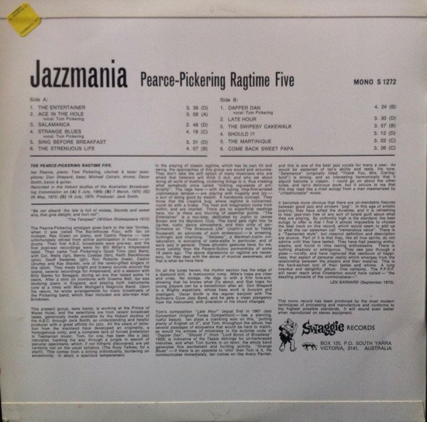 Recorded at Hobart ABC studios 5 July 1969, 7 March 1970, 25 May 1970 and 18 July 1970. Tasmanian jazz band. Despite having "the Jazz Makers" in big letters on the front everywhere in the release & in the links below it is referred to as Jazzmania: http://trove.nla.gov.au/work/34305302?selectedversion=NBD40725358 & http://www.tasjazz.iinet.net.au/archives_hym.html