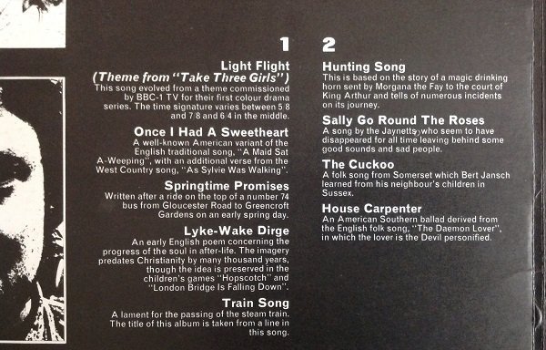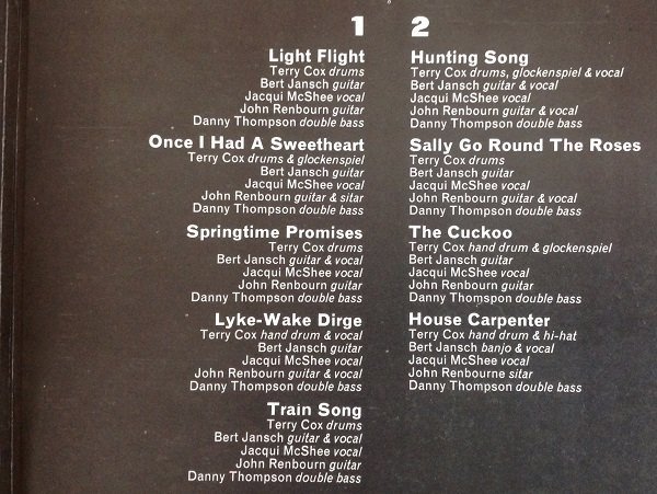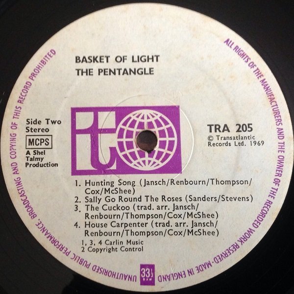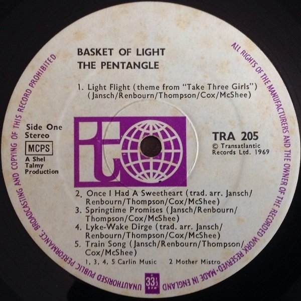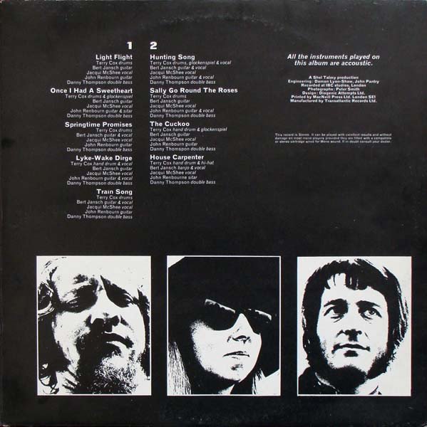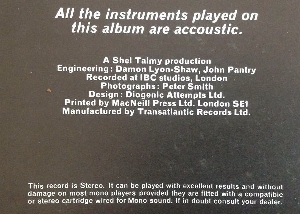 Double concentric label ring pressing.ⓒ Transatlantic Records Ltd. 1969'All the instruments played on this album are accoustic [sic].'Publishing info: A1, A3 to B1, B3, B4 - Carlin Music A2 - Mother Mistro B2 - Copyright Control