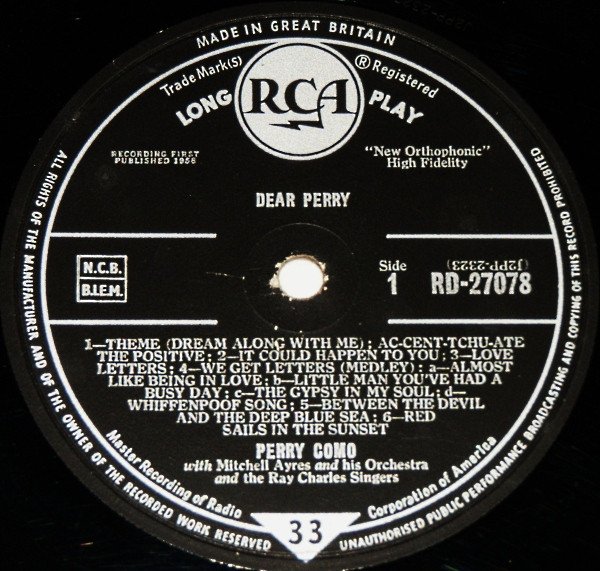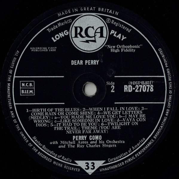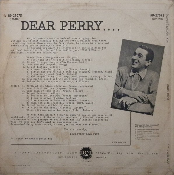 Title on front "Dear Perry - The Perry Como Show" Title on back "Dear Perry..." Title on label "Dear Perry" Catalogue number RD-27078 (front sleeve, rear sleeve, labels), LOP-1004 (rear sleeve). Sleeve: A "New Orthophonic" high fidelity recording © RCA, London 1958 A 'New Orthophonic' high fidelity 33⅓ RPM recording Made in England Printed in England Labels: Made in Great Britain Recording first published 1958 "New Orthophonic" high fidelity