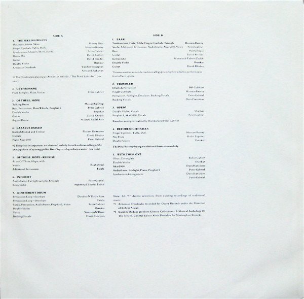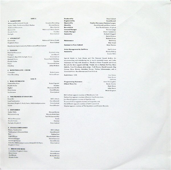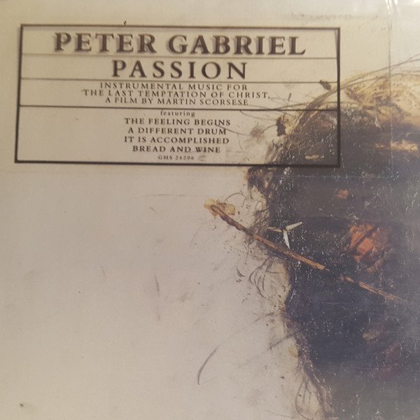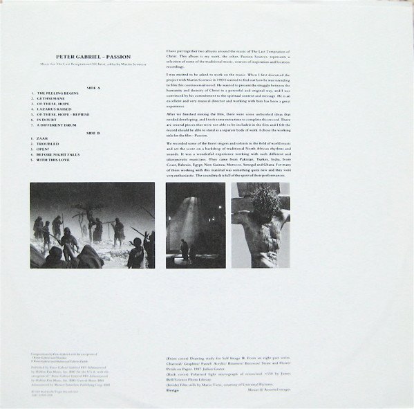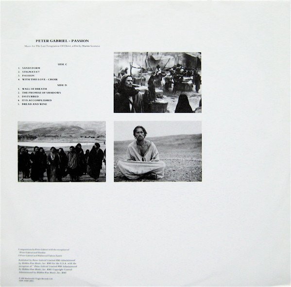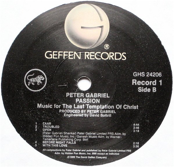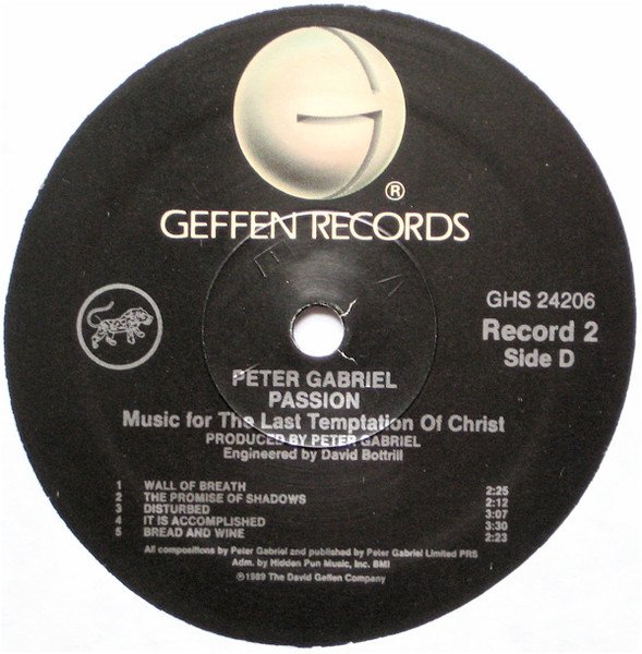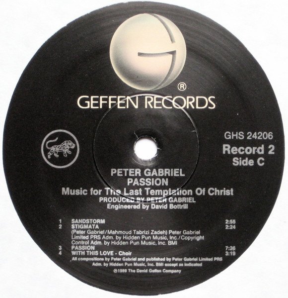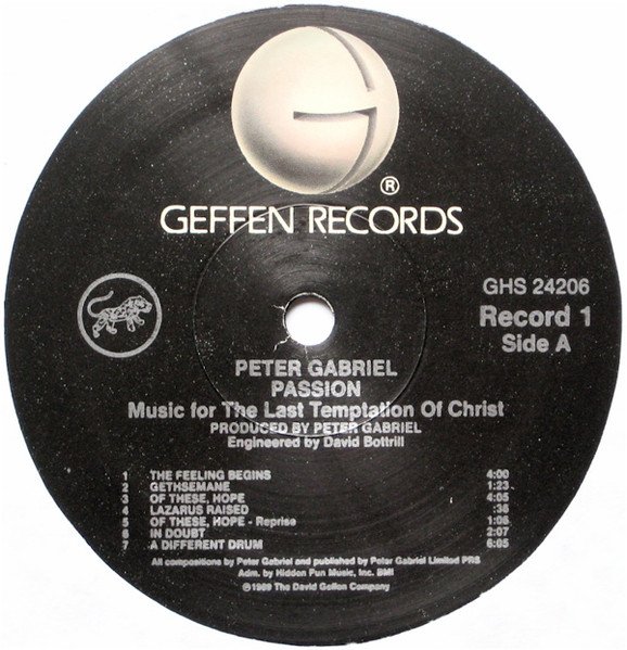 Direct Metal Mastering Music for The Last Temptation Of Christ, a film by Martin Scorsese. Recorded between February 1988 and March 1989 at Real World Studios, Box, England. Mastered at Precision Lacquer. "I have put together two albums around the music of The Last Temptation of Christ. This album is my work; the other, Passion Sources, represents a selection of some of the traditional music, sources of inspiration and location recordings. I was excited to be asked to work on the music. When I first discussed the project with Martin Scorsese in 1983 I wanted to find out how he was intending to film this controversial novel. He wanted to present the struggle between the humanity and the divinity of Christ in a powerful and original way, and I was convinced by his commitment to the spiritual content and message. He is an excellent and very musical director and working with him has been a great experience. After we finished mixing the film there were some unfinished ideas that needed developing and I took some extra time to complete this record. There are several pieces that were not able to be included in the film and I felt that the record should be able to stand as a separate body of work. I chose the working title for the film - Passion. We recorded some of the finest singers and soloists in the field of world music and we set the score on a backdrop of traditional North African rhythms and sounds. It wwas a wonderful experience working with such different and idiosyncratic musicians. They came from Pakistan, Turkey, India, Ivory Coast, Bahrain, Egypt, New Guinea, Morocco, Senegal and Ghana. For many of them working with this material was something quite new and they were very enthusiastic. The soundtrack is full of the spirit of their performances." Peter Gabriel The following tracks contain selections from existing recordings of traditional music. Track A1 - The Doudouks are playing an Armenian melody 'The Wind Subsides', recorded for Ocora Records under the direction of Robert Ataian. Track A4 - Incorporates a traditional melody from Kurdistan. Kurdish Duduks are from Unesco Collection - A Musical Anthology of the Orient, General Editor Alain Danielou for Musicaphon Records. Track B1 - Written around a traditional Egyptian rhythm which is performed to fend off evil spirits. Track B3 - Based on an improvisation by Shankar and Peter Gabriel. Track B4 - The Ney Flute is playing a traditional Armenian melody. Track C2 - Based on an improvisation by Mahmoud and Peter Gabriel. Geffen Records, Manufactured exclusively by Warner Bros. records, Inc., A Warner Communications Company. © 1989 Realworld/Virgin Records Ltd. ℗ 1989 The David Geffen Company. Made in U.S.A. All compositions by Peter Gabriel and published by Peter Gabriel Limited PRS, adm. by Hidden Pun Music, Inc. BMI. B3 also published by Ganesh Music, adm. by Warner-Tamerlane Publishing Corp. BMI. C2 also "published" by Copyright Control, adm. by Hidden Pun Music, Inc. BMI. Black & white printed inner sleeves with credits and pictures. Originally issued with a large hype sticker on the shrinkwrap. Promotional copies will have the sticker directly placed on the cover because they were not shinkwrapped.