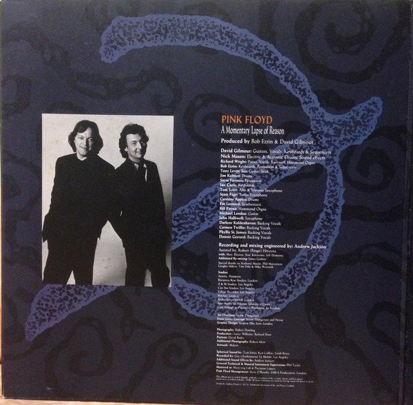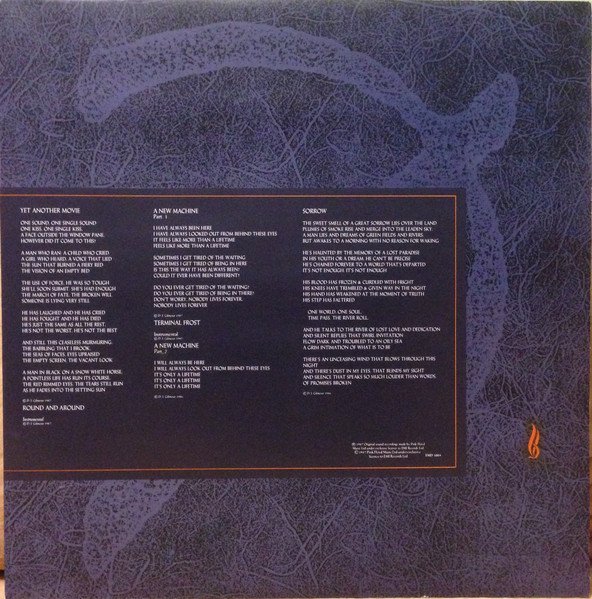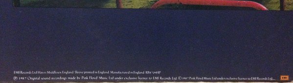 Matt gatefold cover with printed inner sleeve. Sleeve: Studios, Astoria, Hampton Britannia Row Studios, London A&M Studios, Los Angeles Can Am Studios, Los Angeles Village Recorder, Los Angeles Mayfair, London Audio International, London. Spherical Sound recorded at Le Mobile, Los Angeles. Also thanks to Winston Johnson at Cama, Gary Barlogh at Producers Workshop, Air London. This album was recorded digitally, with the exception of the acoustic drums and bass guitar, which were recorded analogue. Dolby SR noise reduction was used for mixing, mastered direct to metal. EMI Records Ltd Hayes Middlesex England. Sleeve printed in England. Manufactured in England. RB8709HP ℗ 1987 Original sound recording made by Pink Floyd Music Ltd under exclusive licence to EMI Records Ltd. © 1987 Pink Floyd Music Ltd under exclusive licence to EMI Records Ltd. Inner sleeve: A1: © D. J. Gilmour/B. Ezrin, 1987 A2, A3: © D. J. Gilmour A. Moore, 1986 A4: © D. J. Gilmour, 1987 A5: © D. J. Gilmour A. Moore, 1986/7 B1, B1a,, B3, B4: © D. J. Gilmour, 1987 B2, B5: © D. J. Gilmour, 1986 Durations do not appear on this release. Timings via stopwatch. Additional runout information: 1st section is stamped, 2nd section starting with EMD is etched