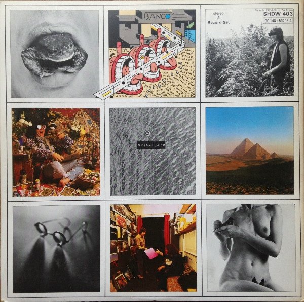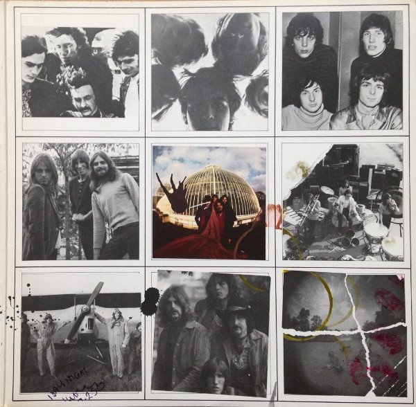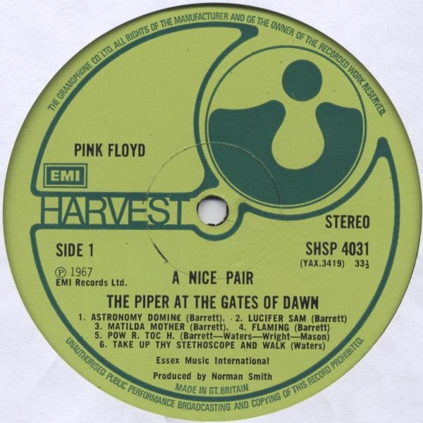 1st UK issue. Green "Harvest" labels. Matt gatefold sleeve with 2 inners die cut on 3 of the 4 corners. A bundling of The Piper At The Gates Of Dawn and A Saucerful Of Secrets with a new cover. Piper At The Gates Of Dawn was released in 1967 and A Saucerful Of Secrets was released in 1968. This version features a picture of "W. R Phang's Dental Surgery" (a genuine business) on the top right on the front cover. This version was withdrawn following objections from Dr. Phang due to dentists not being allowed to advertise. A [url=http://www.discogs.com/release/1479685] later version [/url] came out featuring a picture of a gargling monk. Labels: The Gramophone Co. Ltd (Upper rim text) ℗ 1967 EMI Records Ltd. (A & B-side) ℗ 1968 EMI Records Ltd. (C & D-side) Made in GT Britain Sleeve: Made and printed in Great Britain. The Piper At The Gates Of Dawn: Produced 1967 A Saucerful Of Secrets: Produced 1968 Release date sourced from pinkfloydarchives.com