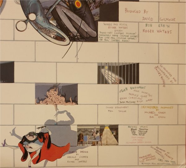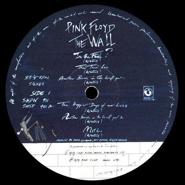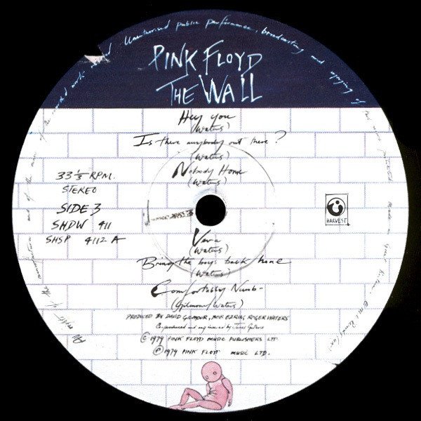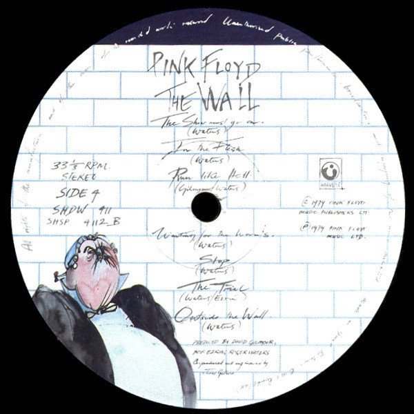 1st pressing with picture labels in gatefold sleeve with plastic sticker that adheres to the sleeve, but is not permantly stuck on. Special note: This is a new 2023 submission of the 1st UK issue. The original 1st issue [r2041618] (ID 2041618) was incorrectly merged with [r367511] (ID 367511) which is most likely the 2nd issue. So check your copy again please. Inner sleeves also feature the "Wall" design with lyrics (graphics by Gerald Scarfe). The track order on the inners is not the same as featured on the album. Specific to the first issue sleeve: Band members are not listed on the inside cover. It only says "Words and Music - Roger Waters. Except..." and "Produced By David Gilmour, Bob Ezrin, Roger Waters". Re-pressings added band member credits and had other minor alterations. No bar code on the back cover. The Wall is cream coloured, not true white. The bricks on the front cover are not aligned right to the bottom of the cover on the outside or inside. There are two 1st pressing sleeve variants: 1. A single sheet of wrap-around cardboard with the seam across the inner top edge of the cover. 2. Two sheets of cardboard, with seams at the top and bottom of the cover. Cardboard is heavy thickness. There are two 1st pressing lyric inner sleeve variants (Both are on thick card with rounded corners and a nine-inch thumb notch at the top): 1. Sides 2 and 4 have the catalog number of the specific record listed on a single line in the lower right corner. 2. Sides 2 and 4 have the catalog number (SHDW 411), international catalogue number (OC-158 63410), and the UK catalogue number (SHSP 4111) in the lower right corner. Mastered at The Mastering Lab (Los Angeles, CA, USA). Recorded at Superbear (Miravel, France), Producers Workshop (Los Angeles, CA, USA) & C.B.S. (New York, NY, USA) between April and November 1979. Three different catalog numbers, one for the album and one for each disc: SHDW 411 = album OC-15863410 = inner sleeve 1 SHSP 4111 = disc 1 OC-15863411 = inner sleeve 2 SHSP 4112 = disc 2 On labels: © 1979 Pink Floyd Music Publishers LTD. ℗ 1979 Pink Floyd Music LTD. On inner sleeves: © Roger Waters 1979 Pink Floyd Music Publishers LTD. ℗ 1979 Runouts are stamped.