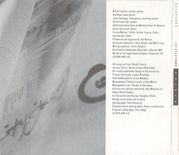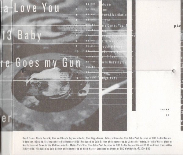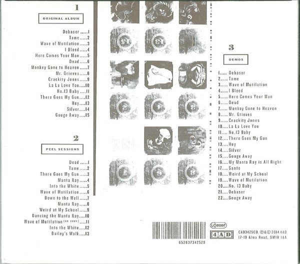 6-panel digisleeve. CD1 Recorded at Downtown Recorders, Boston, MA. Mixed at Carrige House Studios, Stamford, CT. © 1989 4AD Ltd. Anniversary edition mastered: at Abbey Road Studios. © 2014 4AD Ltd. All tracks published: Songs of Universal Inc. Dead, Tame, There Goes My Gun and Manta Ray recorded at The Hippodrome, Golden Green for The John Peel Session on BBC Radio One on 9 October, 1988 and first transmitted 18 October, 1988. Into the White, Wave of Mutilation and Down to the Well recorded at Maida Vale 3 for The John Peel Session on BBC One on 16 April, 1989 and first transmitted 2 May, 1989. Licensed courtesy of [l96668]. ℗ 2014 BBC Manta Ray, Weird at My School and Dancing the Manta Ray recorded at Fort Apache, Boston, MA. Taken from the single [m=16805]. ℗ 1989 4AD Ltd. Wave of Mutilation (UK Surf) recorded at Palladium, Edinburgh. Into the White recorded and mixed at Fort Apache, Boston, MA. Bailey's Walk recorded at Eden Studio, Newtonville, MA. Taken from the single [m=17174]. ℗ 1989 4AD Ltd. Demos recorded 8-13 September, 1988 on 8 track at Eden Sound, Newtonville, MA. Engineered by Claude Fixler except for tracks 3, 11, 13, 19 and 22 recorded 1 April, 1988 (studio unknown). Track 5 recorded at Fort Apache, Boston, MA. Licensed from [l4184] ℗ 2014 4AD Ltd. except Here Comes Your Man ℗ 1987 [l4184] ℗&© 2014 4AD 17-19 Alma Road, SW18 1AA