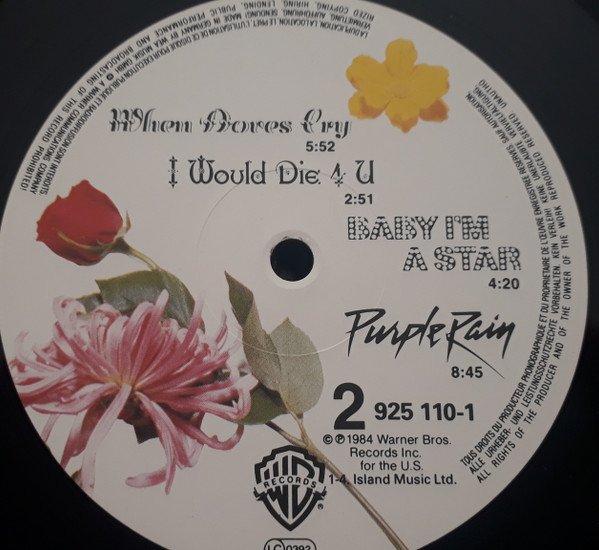 Purple circled sticker on sleeve with white yellow or white text: "BRITISH RECORD INDUSTRY AWARDS WINNER! Best Film Soundtrack (K 9251101)" 925 110-1 circled U France: "WE 361" Includes the Prince and related artists (Vanity 6 / Sheila E. / The Time) discography sheet Inner sleeve with London P.O. Box address Has publisher credits on the labels, but no rights society, catalogue number: 925 110-1