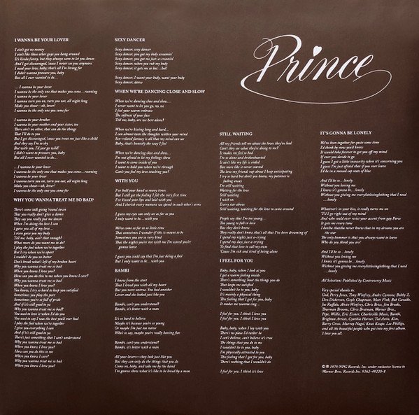 Cover: Manufactured in the E.U. Dust sleeve: © ℗ 1979 NPG Records Inc. under exclusive license to Warner Bros Records Inc. 9362-49220-8 Labels: 553365-1 © ℗ 1979 NPG Records Inc. under exclusive license to Warner Bros Records Inc. Manufactured in the Netherlands Vinyl, matrix/runout: 14944 2A and 14944 2B are stamped the rest is etched