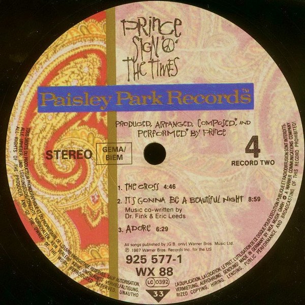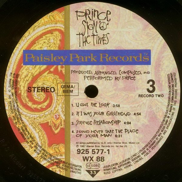 Blue heart-shaped title/barcode sticker: [originally on shrink] Specially-priced two record set 925 577-1 - WX 88 © 1987 Paisley Park Records ℗ 1987 Warner Bros. Records Inc for the US. Hype sticker: Double Album includes [url=https://www.discogs.com/master/52776]Sign 'O' The Times[/url] [m=109246] [m=22072] [m=22055] UK: WX 88 · 925 577-1 Removable Sticker Spine: UK: WX 88 925 577-1 Black dust sleeve: Created & mixed at Paisley Park, Sunset Sound & Dierks Studio Mobile Trucks. Labels: 925 577-1 WX 88 All songs published by (G.B. only) Warner Bros. Music Ltd. ℗ 1987 Warner Bros. Records Inc for the US. Made in Germany by WEA Musik GmbH Similar edition(s): [r5989949] (initial run without barcode printed on the cover)