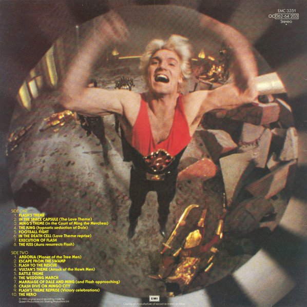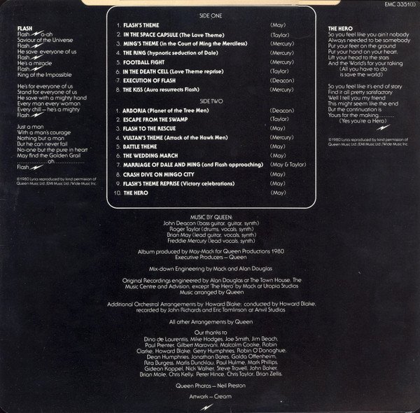 At least two different versions of the inner sleeve exist, apparently within same vinyl and outer sleeve pressing. This version is printed on heavy greyback card with die-cut centre hole on one side and rounded corners. [url=http://www.discogs.com/Queen-Flash-Gordon-Original-Soundtrack-Music/release/4240669]Another version[/url] exists with the inner sleeve printed on lighter all white card with no die-cut centre hole. Catalogue number EMC 3351 (spine, rear sleeve and labels), OC 062-64 203 (rear sleeve). Sleeve: ℗ 1980 Original sound recording made by Queen Productions Ltd./Starling Productions Ltd. Inner sleeve: © 1980 Lyrics reproduced by kind permission of Queen Music Ltd./EMI Music Ltd./Wide Music Inc. Album produced [...] for Queen Productions 1980. Original recordings engineered [...] at The Town House, The Music Centre and Advision, except 'The Hero' at Utopia Studios. Additional orchestral arrangements [...] recorded by John Richards and Eric Tomlinson at Anvil Studios. Labels: Manufactured in the UK by EMI Records Limited. ℗ 1980 original sound recording made by Queen Productions Ltd/Starling Productions Ltd All songs published by Queen Music Ltd/EMI Music Ltd/Wide Music Inc. Produced for Queen Productions Ltd Runouts: On all variants, 'NIZK W' is etched; remainder is stamped. Variant 4: Side A - with 'EMC 3351 A-3' at 6 o'clock, '17' ('1' above '7') is at 3 o'clock, and '1' at 9 o'clock; Side B - with 'EMC 3351 B-4' at 6 o'clock and 'NIZK W' at 12 o'clock '76' ('7' above '6') is at 3 o'clock, and '6' at 9 o'clock.