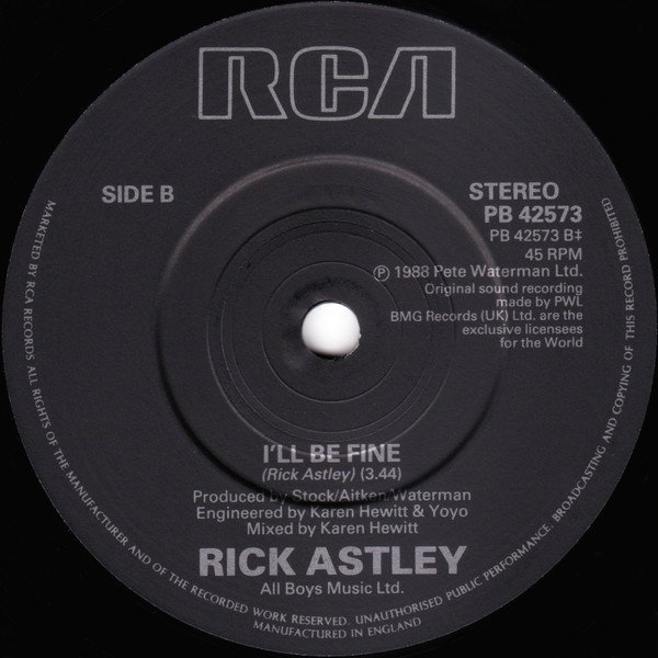 This release sleeve has UK Tour December 1988 8th Edinburgh Playhouse Theatre 10th Newcastle City Hall 12th Manchester Apollo Theatre 14th London Wembley Arena 15th London Wembley Arena 17th Birmingham NEC 18th Birmingham NEC 20th Bournemouth ICC 22nd Manchester Apollo Theatre ℗ 1988 Pete Waterman Ltd. Original Sound Recordings made by PWL. BMG Records (UK) Ltd. are the exclusive licensees for the world. © 1988 BMG Records (UK) Ltd. Manufactured in England. Printed in England