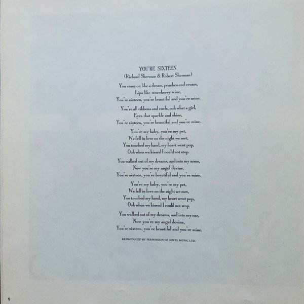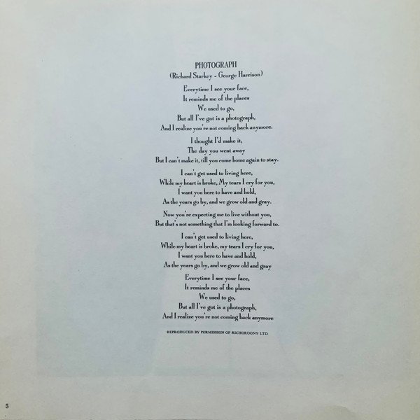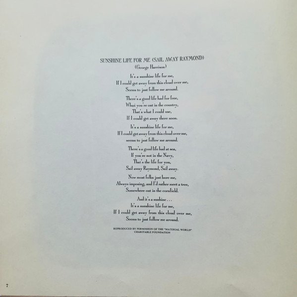 Housed in an unlaminated gatefold picture sleeve with integral twenty page booklet. Very similar to [r=31463984], but different printing house. First cat.# on cover & booklet, 2nd on labels, 3rd (EMI int. cat.#) on cover back. ℗ 1973 EMI Records, Limited Made in Gt Britain Publishing: • John Lennon - A1. • A. Schroeder Music Publ. Co. - A2. • Richorooney Ltd. - A3, B2, B4. • The Material World Charitable Foundation - A4. • Jewel Music Ltd. - A5. • Braintree Music - B1. • McCartney Music Ltd./ATV Music Ltd. - B3. • Harrisongs Ltd. - B5. In booklet: Printed by Euro Albums Holland B.V. Stamped runouts. Matrix # on labels in parentheses.