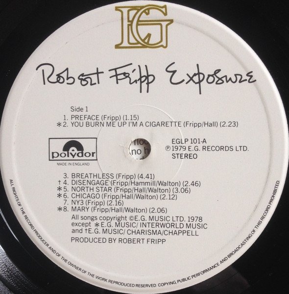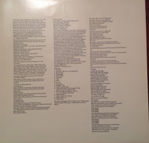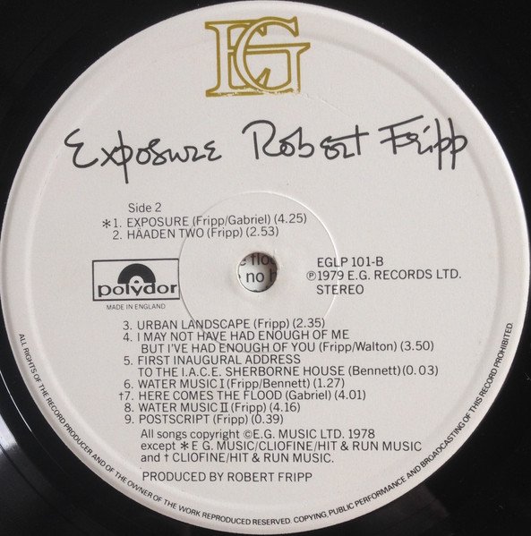 Recorded mainly and mixed entirely at The Hit Factory, New York between January 1978 and January 1979 Track for Exposure / Here Comes The Flood recorded at Relight Studios, November 1977 Track for Water Music II recorded at The House Of Music, New Jersey, July 1977 All songs copyright ©E.G. Music Ltd. 1978 except A1, A5, A5, A8 E.G. Music Ltd./Interworld Music and A4 E.G. Music Ltd./Charisma /Chappell and B1 E.G. Music Ltd./Cliofine/Hit & Run Music and B7 Cliofine/Hit & Run Music Some copies came with a free postcard (pictured).