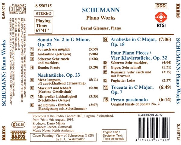 Playing Time: 67:41 Recorded at the Radio Concert Hall, Lugano, Switzerland, from 7th to 9th August, 1993. Cover Painting: View of Schneeberg (1828) MADE IN GERMANY ℗ & © 1994 HNH International Ltd. DISTRIBUTED BY: MVD MUSIC AND VIDEO DISTRIBUTION GmbH CD manufacturing: Sonopress