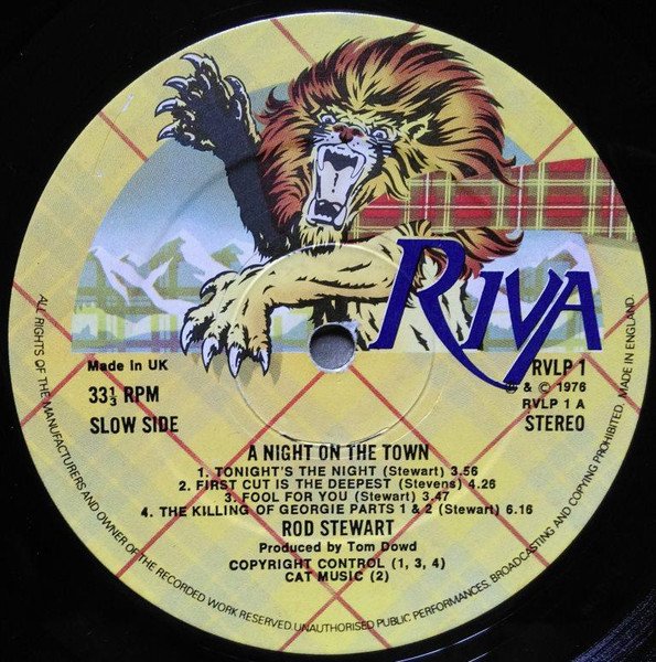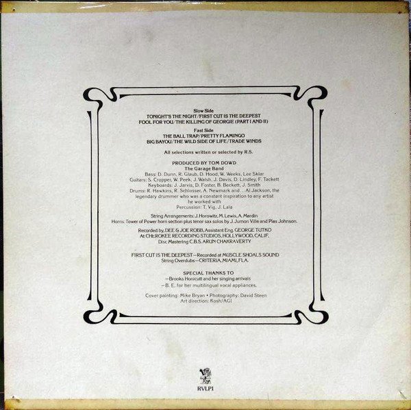 UK release, printed card inner sleeve, different label typeface Bottom line on back cover extends under the cat# and reads: ℗ & © 1976 Riva Records. A subsidiary of Tartan Records Ltd. 90 Wardour Street, London W1V 3LE. Distributed by WEA Records Ltd. [W logo] A Warner Communications company. Sleeve printed and made in England by Gothic Print Finishers Ltd., London SE9 2EQ. The label matrix doesn't have an asterisk. Similar copy, [r1367468] has an asterisk. All selections written or selected by R.S. First Cut Is The Deepest - Recorded at Muscle Shoals Sound String overdubs - Criteria, Miami, FLA