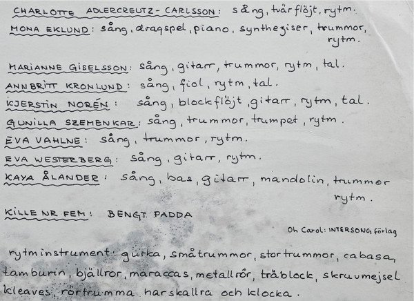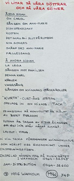Recorded autumn 1976 at Musiknätet, .Waxholm Track order for A5 and A6 reversed on jacket and labels. In this sub the track order is listed as per audio and labels. Sången Om Kvinnans Otäcka Roller = "What You've Done To Me" in original