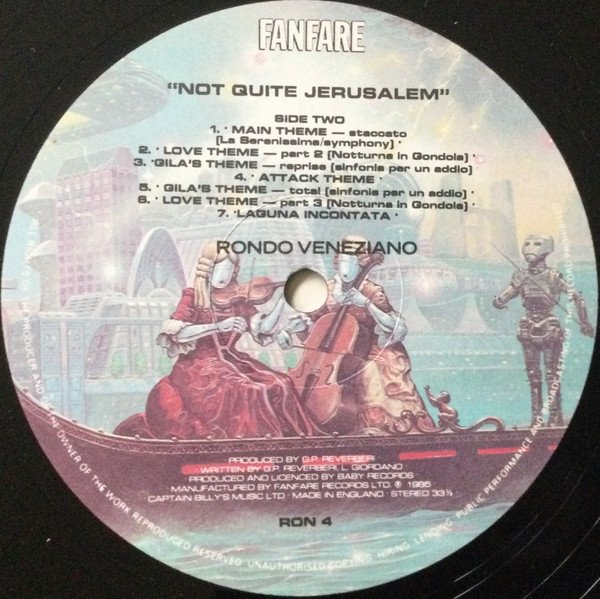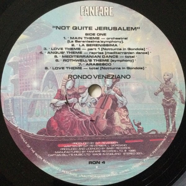 Soundtrack album for the 1985 film "Not Quite Jerusalem", almost entirely comprised of tracks from [m=73030], [m=73026] and [m=73031], utilising both the original tracks and previously unreleased variations and recordings of the pieces.A2, A5, A6, A7, B5 & B7 are the original album tracks. A1, A3, A4, A8, B1-B3 & B6 are previously unreleased recordings (note that all instances of "Notturno in Gondola" are previously unreleased). B4 is an entirely new piece.