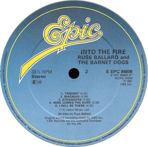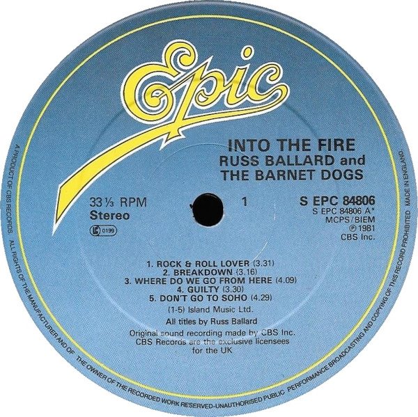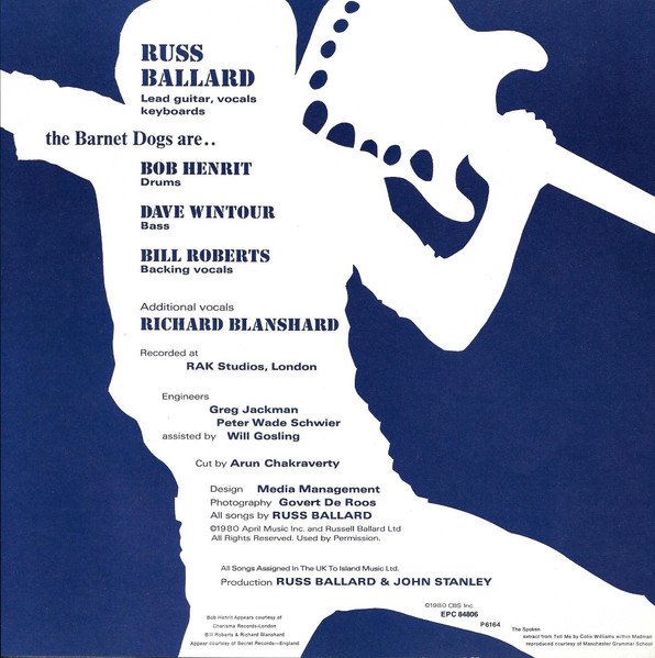 ℗ 1981 CBS Inc. / © 1981 CBS Inc. Epic is a Registered Trademark of CBS Inc. © 1980 April Music Inc. & Russell Ballard Ltd. Front cover credits only Russ Ballard; back cover, labels and spine credit Russ Ballard and The Barnet Dogs [a415368] appears courtesy of Charisma Records–London [a631360] & [a2175824] appear courtesy of Secret Records–England Catalogue numbers: S EPC 84806 – labels EPC 84806 – sleeve Released with single sheet insert with credits and lyrics All songs assigned in the UK to Island Music Ltd. CBS Records are the exclusive licensees for the UK Shorepak by Shorewood Packaging Co. Ltd. England Made in England In the runouts the last A appears as Λ = "broken" A