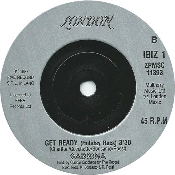 Ibiza Records 886 241-7 Mulberry Music Ltd. T/A London Music (P) 1987 Five Records S.R.L. Milano (C) 1987 Five Records S.R.L. Milano Licensed To FFRR Records Ltd. Silver injection-moulded labels. This issue has a different label layout to others with the same cat. #. The uncredited pressing company is derived from the logo of the group [l=AGI] / Audio Graphic Industries, we can find on the run-out grooves. Disco France was the pressing plant of this group.