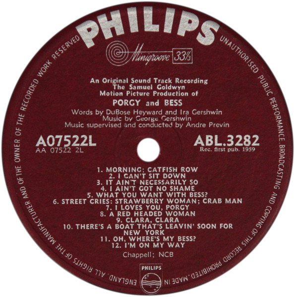 —Sleeve info— An Original Sound Track Recording Performances from the Sound Track of The Samuel Goldwyn Motion Picture Production of Porgy And Bess Todd-AO® Technicolor® Distributed By Columbia Pictures A Product Of Philips — Gatefold sleeve with 4 extra sheets inside, contains color stills from the movie Liner notes in English Empty spine Catalog#s: R 07522 L, ABL 3282